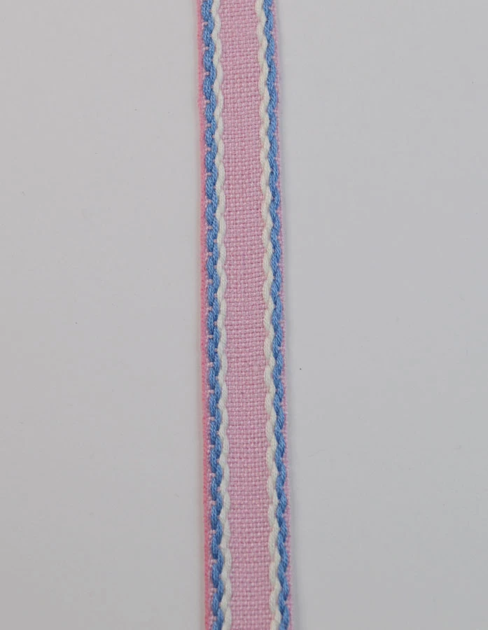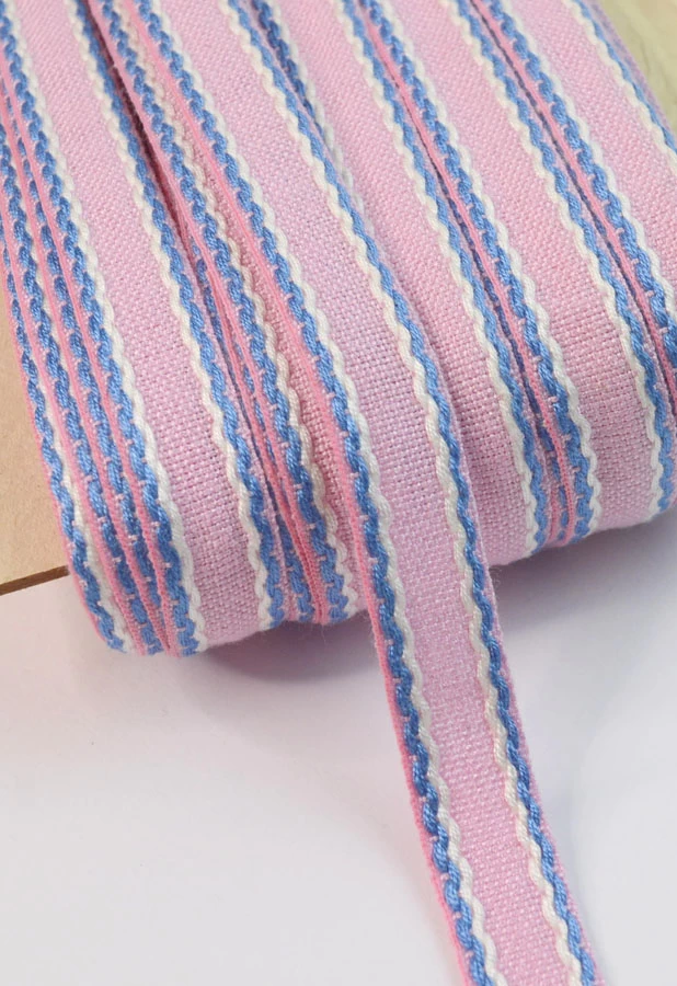 Cotton stitched edge braid cotton tape in pink, blue & white in 15mm (50m). Perfect for dressmaking and crafting.