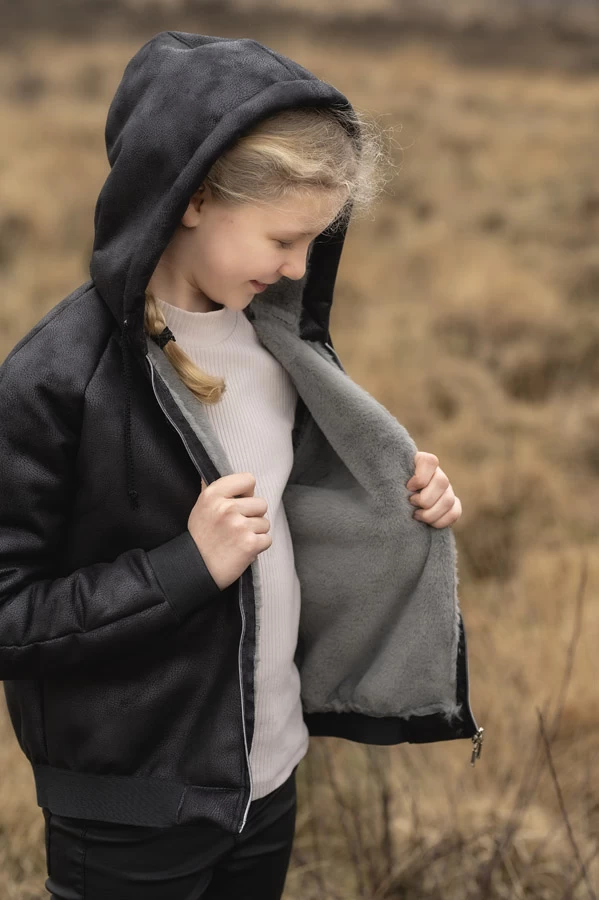 Our luxury fur lined, faux suede/leather fabric has a gunmetal grey colour, perfect for designing warm aviator coats, cosy biker and bomber jackets!