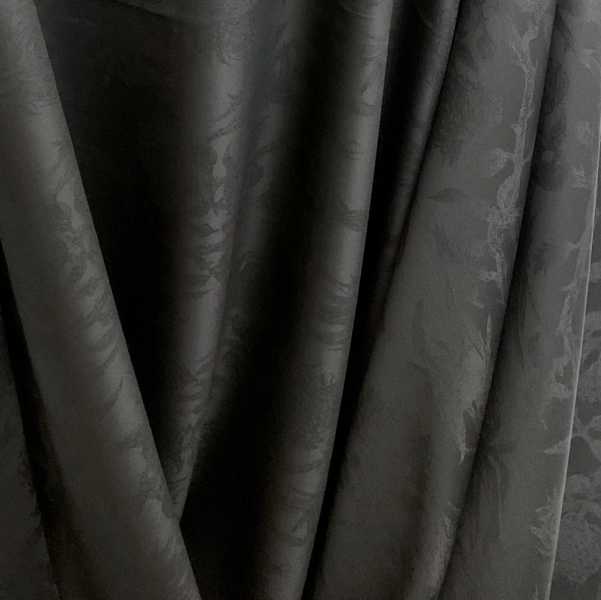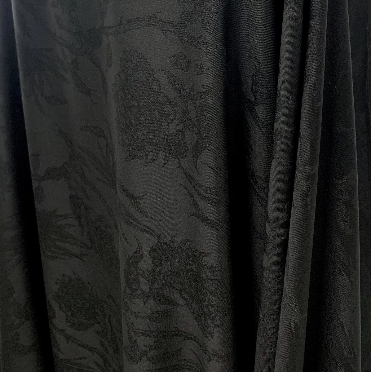 | 145cm wide fine woollen suiting in black with a grey colour woven jacquard pattern. A wonderful hand and beautifully drapey. This cloth comes from a famous high-end British menswear label. | |