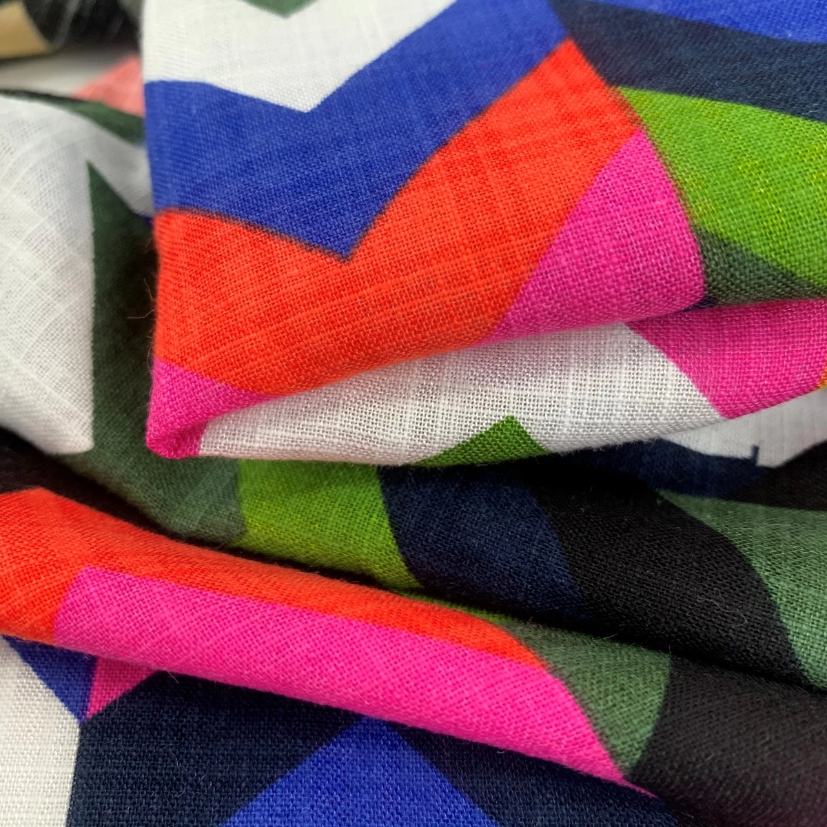 | Brightly coloured zigzag linen look dress fabric for shirts and blouses and dresses. Made from cotton and viscose, this has a nice soft hand but has an element of ‘see-throughness’ about it so ideally would need to be worn with an undergarment or lined. Limited stocks.