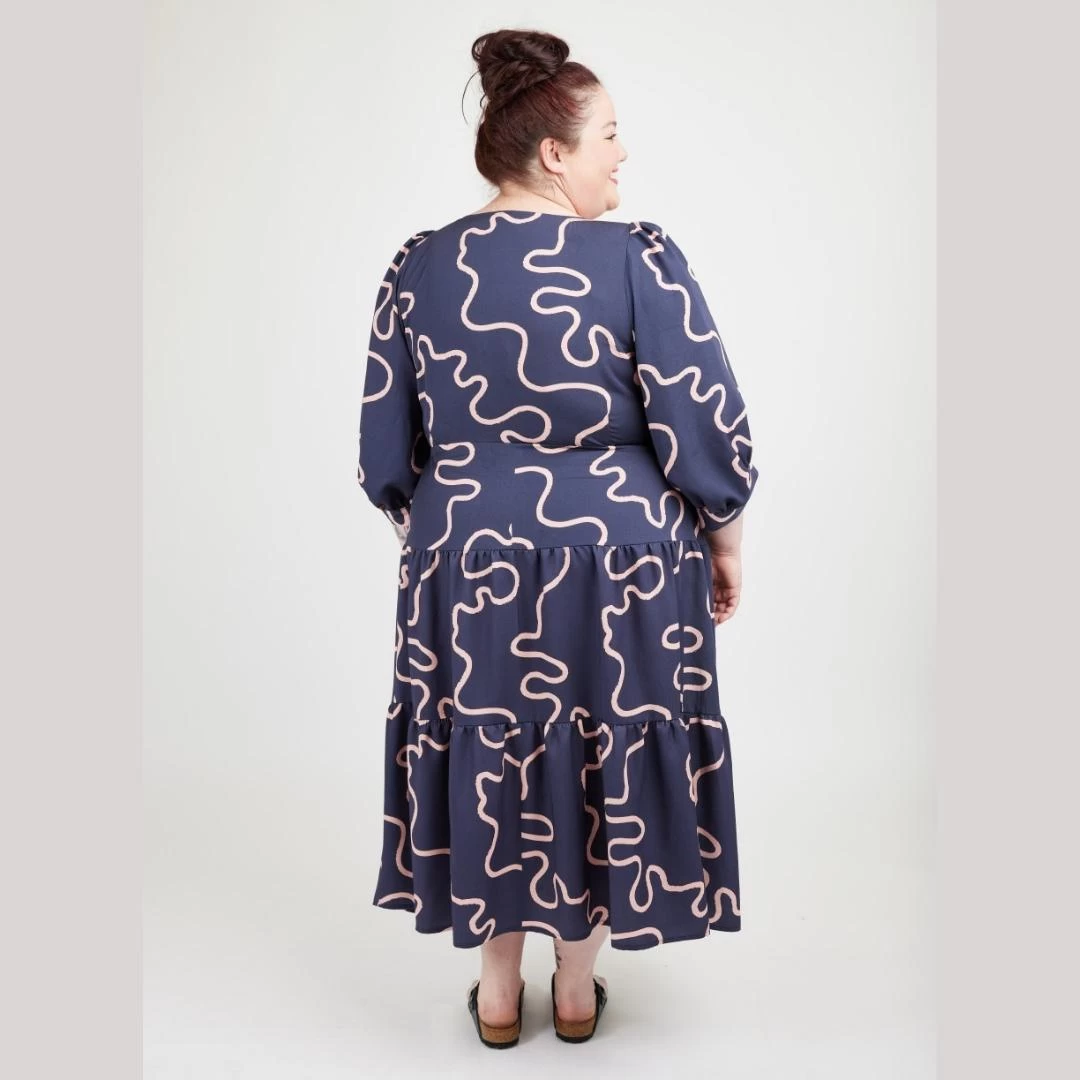 This on-trend dress features three customizable views. View A boasts an ankle-length three-tiered skirt with bishop sleeves and large angled cuffs. View B is a knee-length full skirt with short sleeves, while View C features a knee-length full skirt with on-trend puff sleeves. If you prefer wearing tops, simply sew View A with just the top skirt tier, and you’ll have a gorgeous peplum top.
