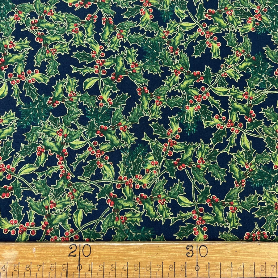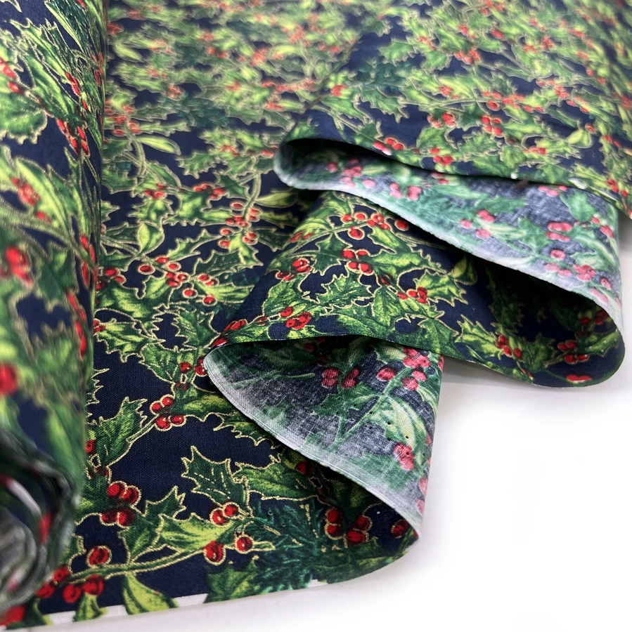 | ‘Night Holly’ is a beautiful traditional style, navy cotton cloth with a Christmas-themed red and green holly bush print. Fantastic for producing Christmas decorations and crafts! This high quality Christmas cotton is perfect for fabricating festive table cloths, Christmas stockings, bunting, advent calendars, shirting, dresses and more! | |