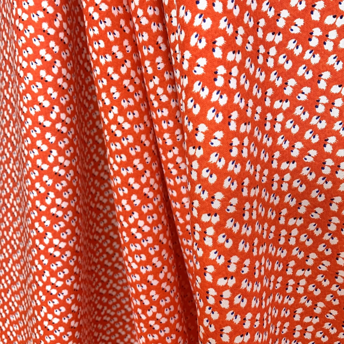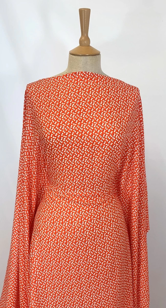 | Silky soft high twist lightweight viscose challis dress fabric in a flame red leaf design. This really is superb quality, finely woven with a good amount of yarn in it so no lining required if you don’t want to. It falls through your fingers and it drapes beautifully. It is breathable, lightweight and approximately 115 g/m². It needs to be washed at 30 degrees. There will be a small amount of shrinkage but not much maybe about 3%, so please bear that in mind and wash before you make it up. Enjoy! A great summer dress fabric! | |