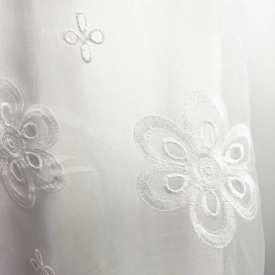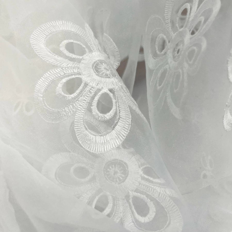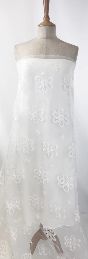 This is a beautiful organza in ivory with a large scale embroidered daisy floral design. Perfect for wedding dresses. We have lined this with our cloud viscose jersey in cream.