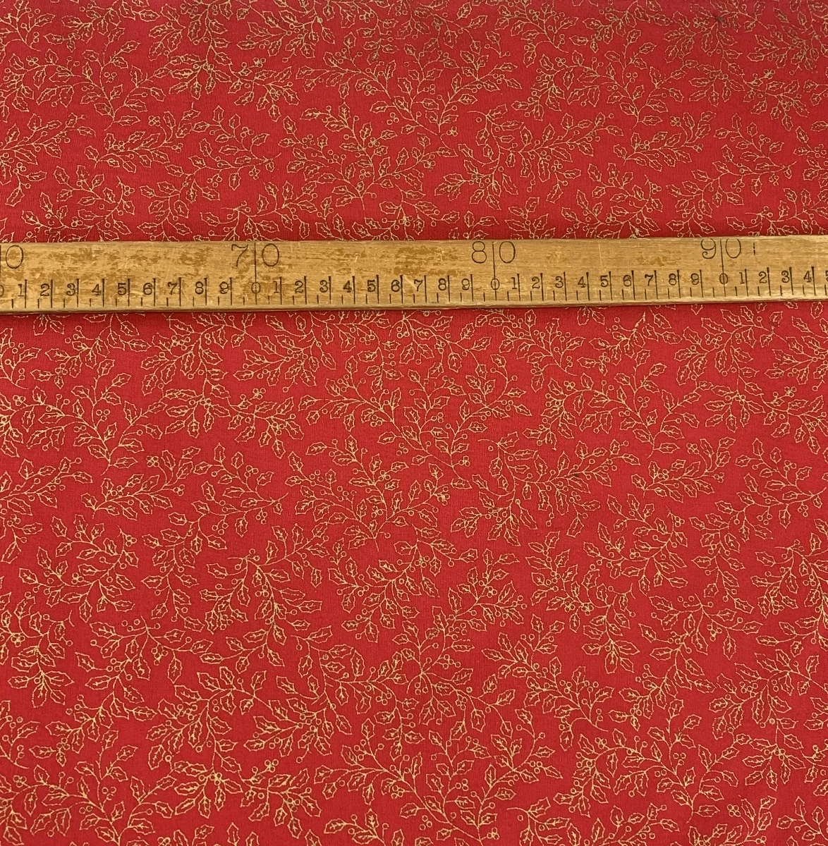 | Christmas holly print in red and metallic gold. 110cm wide, 100% Cotton craft fabric. | |