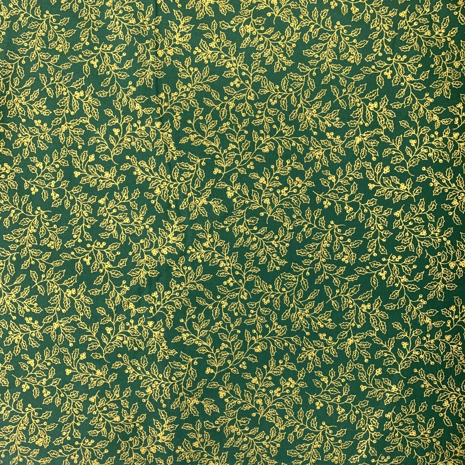 | 140cm wide good quality cotton poplin fabric with a ‘christmasy’ holly bush print in gold on a green ground. Good for Christmas decorations & crafts. | |