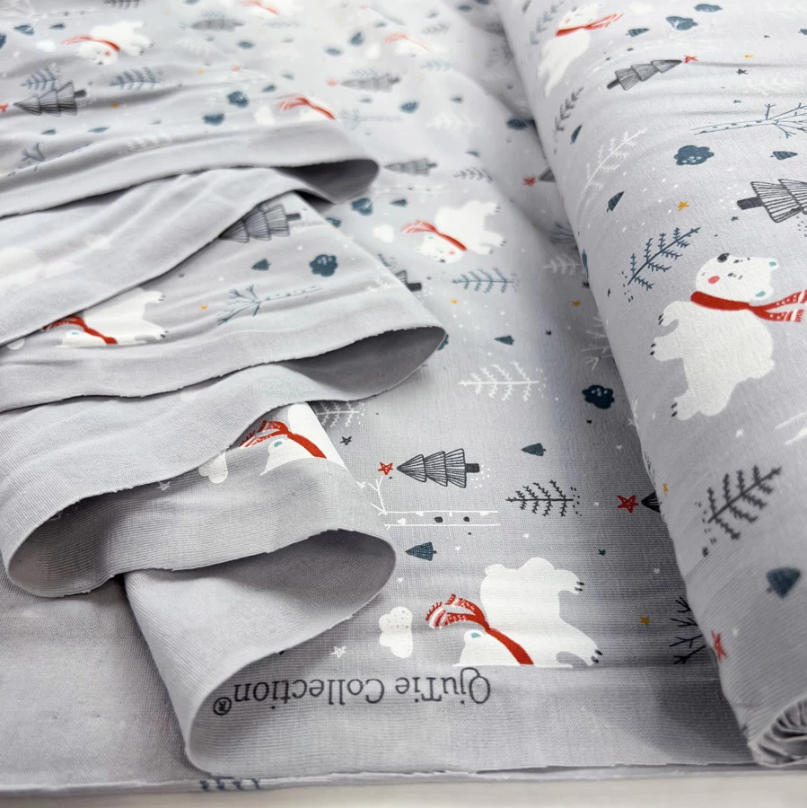 This beautiful stretch jersey fabric features a super cute polar bear print on a grey cloth.