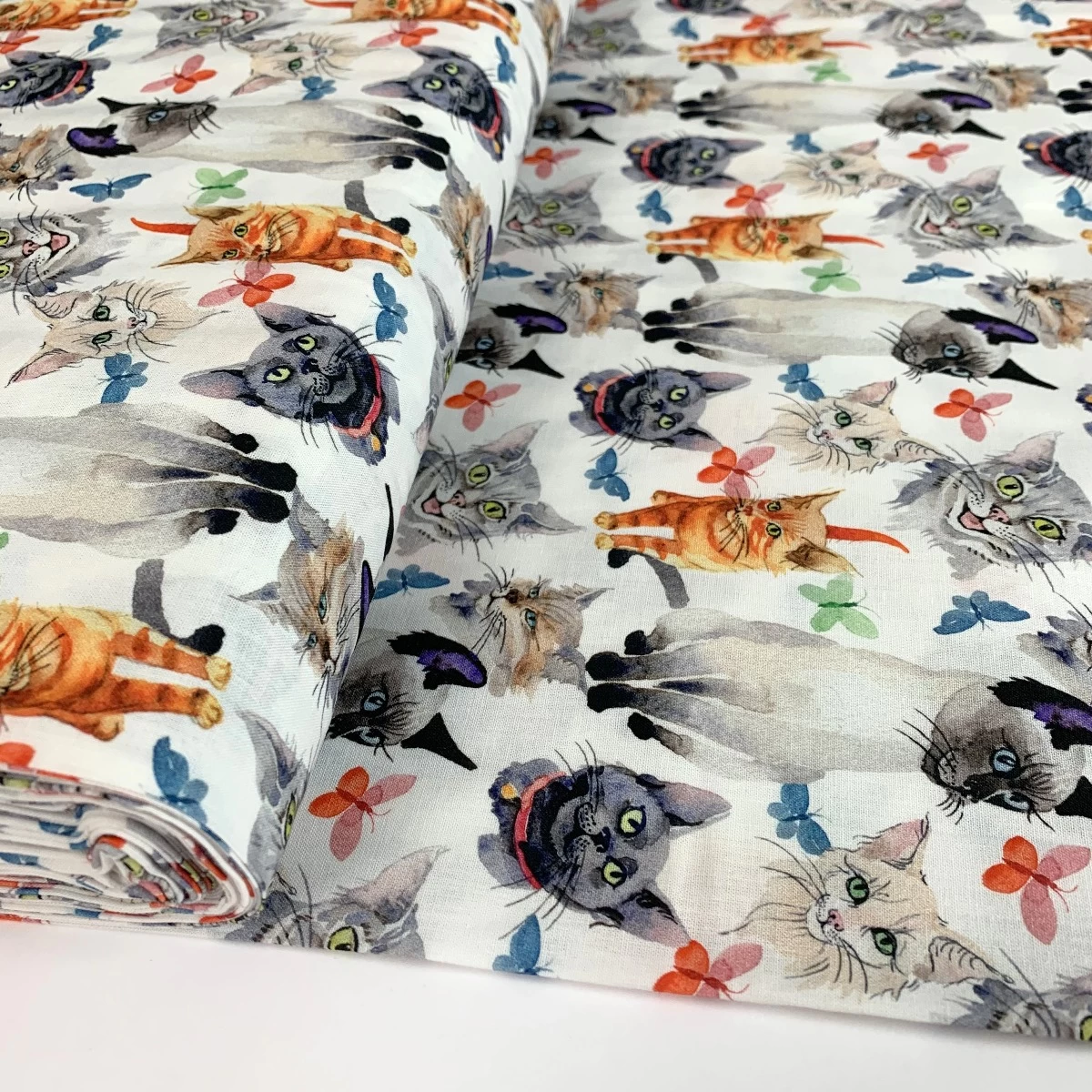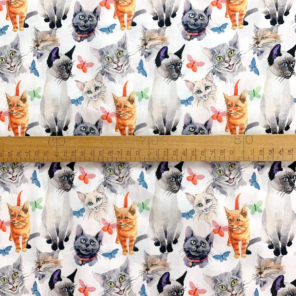 Made from a soft and luxurious cotton, this fabric boasts a stunning print of beautifully painted watercolour cat faces on a gentle white background. With a generous width of 150cm, this superb-quality craft cotton is an excellent choice for dressmaking.