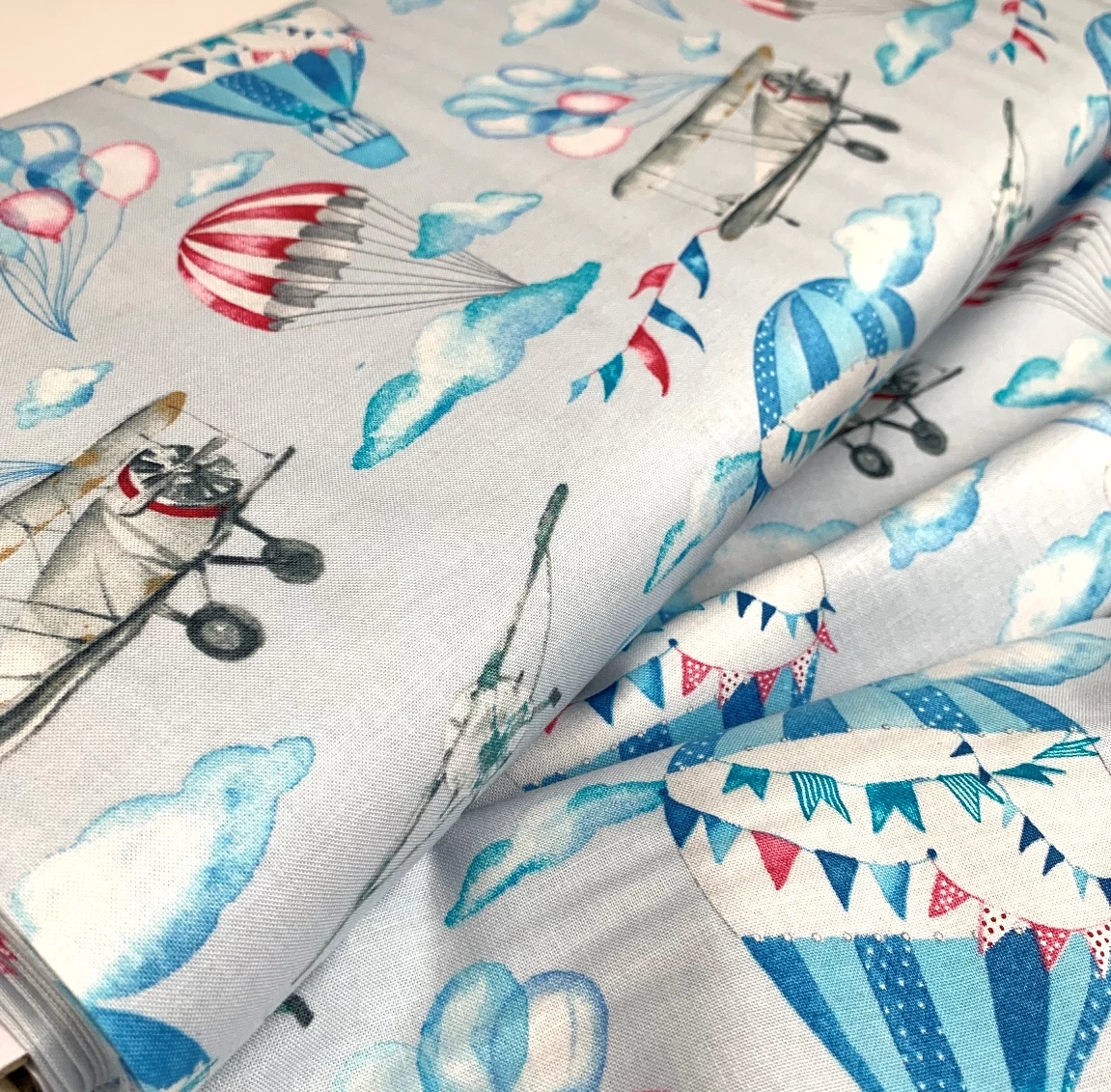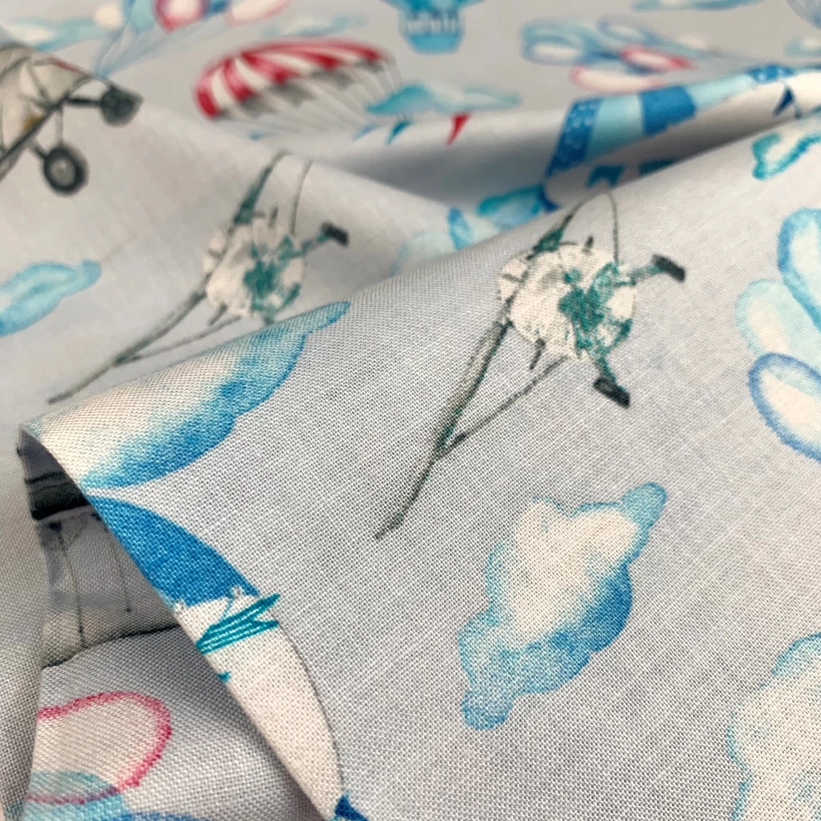 Let your creativity soar as you fashion delightful children’s dresses and shirts with this enchanting fabric. The captivating sky scene, with its hot air balloons and planes, invites imaginative adventures. The playful combination of blue shades and accents of red adds a vibrant touch to the pale blue background, creating a joyful and whimsical design.
