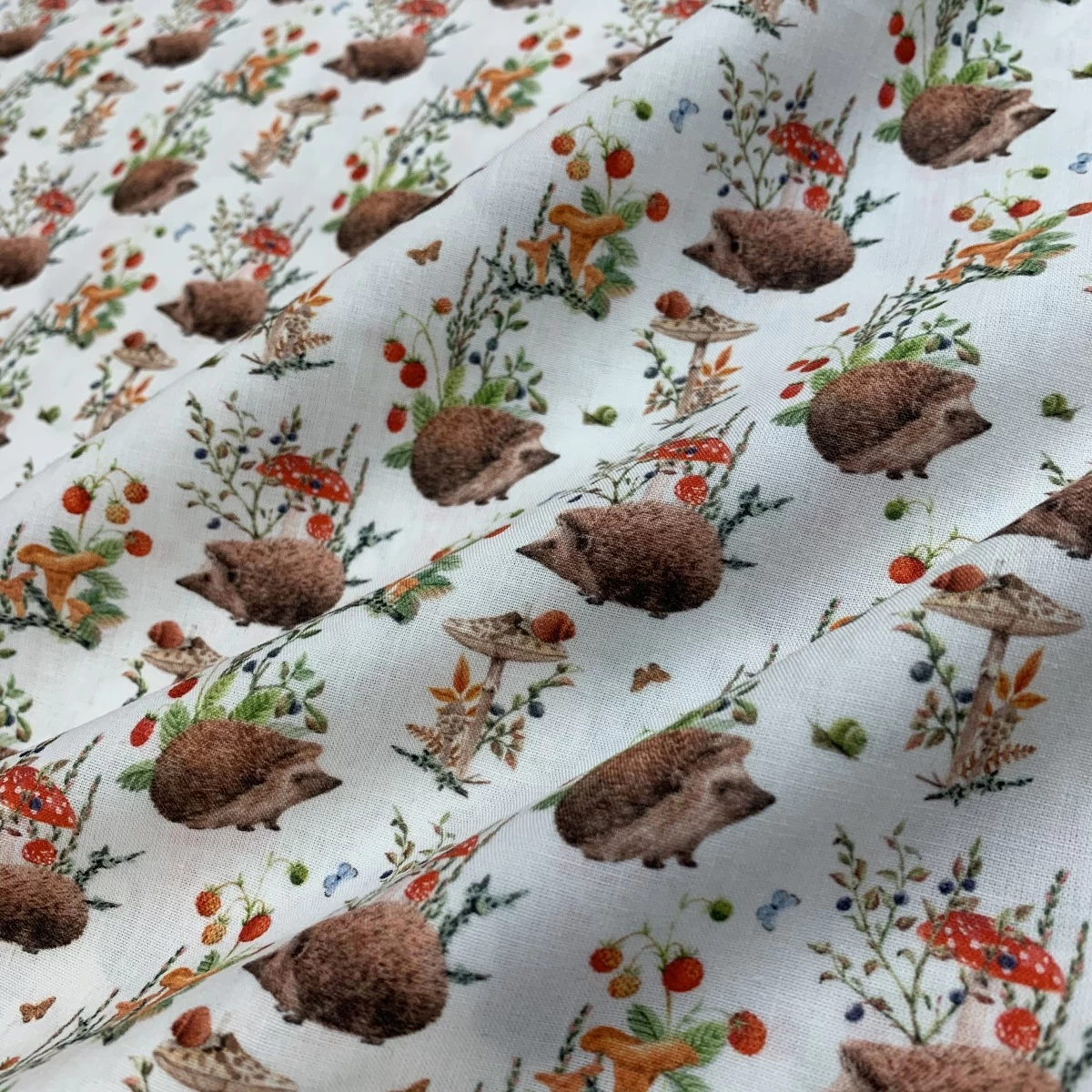 This gorgeously soft cotton quilting fabric features a magical wonderland where beautiful drawn hedgehogs hide among strawberries, shrubbery and mushrooms on a soft white background. This fabric is a true delight for your creative projects.