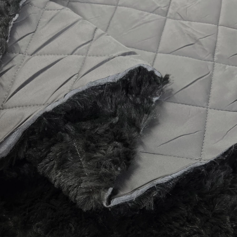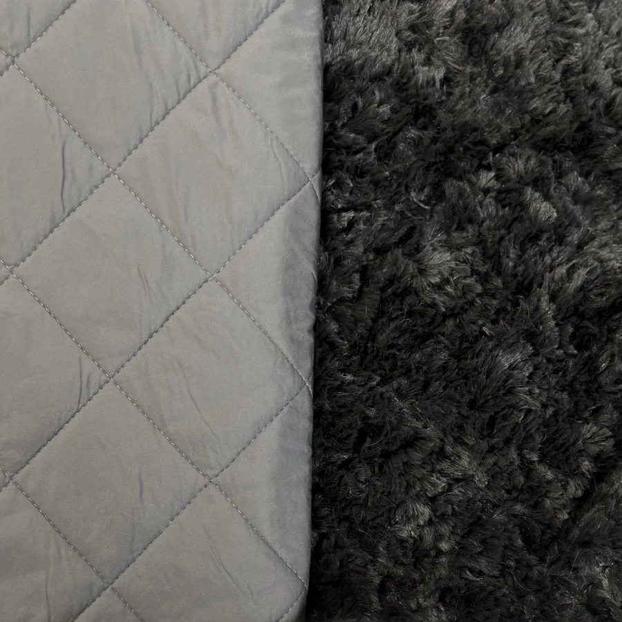 150cm wide faux fur lined diamond quilted fabric, a perfect combination of style and functionality. This fabric features a water and wind-resistant nylon face with a grey hue that adds a touch of elegance to any project. The reverse side of this fabric is lined with a luscious slate grey coloured furry fleece that’s incredibly soft and cosy to the touch, making it perfect for all your cold weather needs.