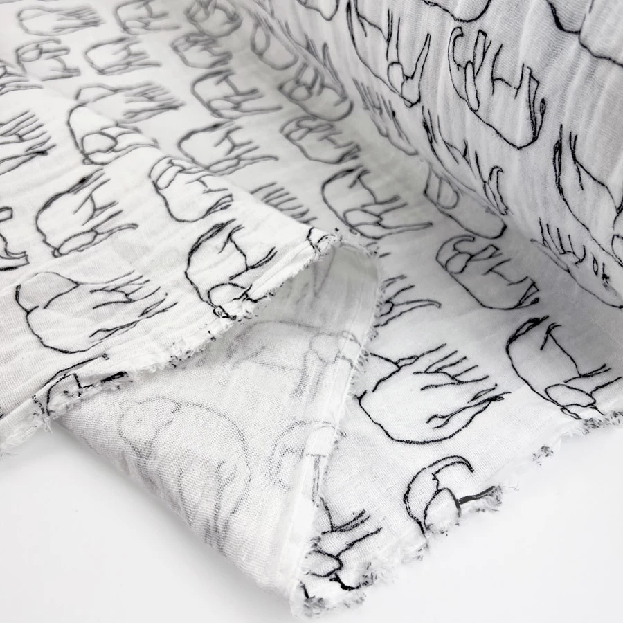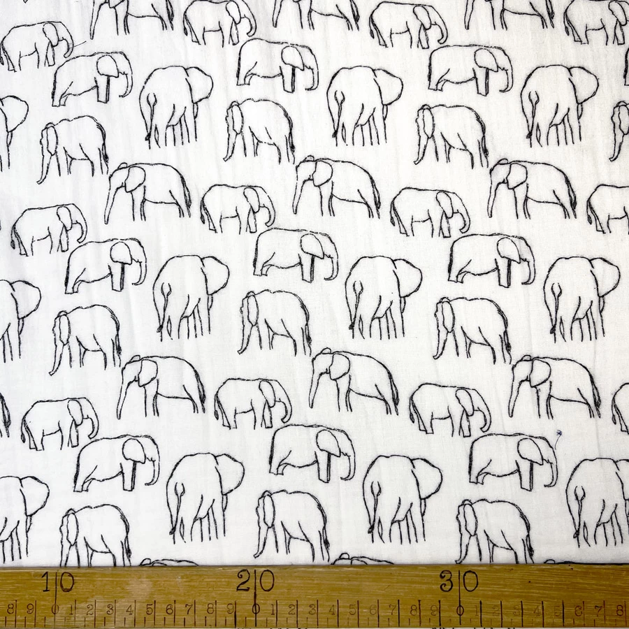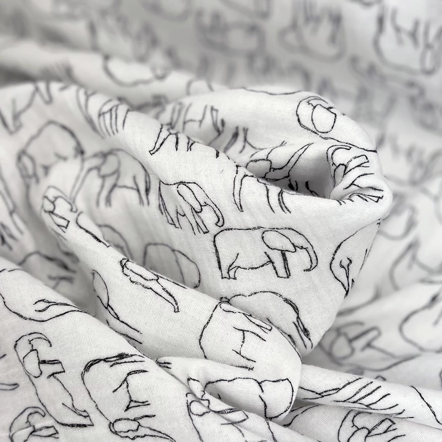 This delightful white double gauze fabric, features a charming drawn, roaming elephant print. This fabric is a dream come true for creating adorable children’s garments, dresses, and soft furnishings. The whimsical design adds a touch of playfulness and innocence to any project.