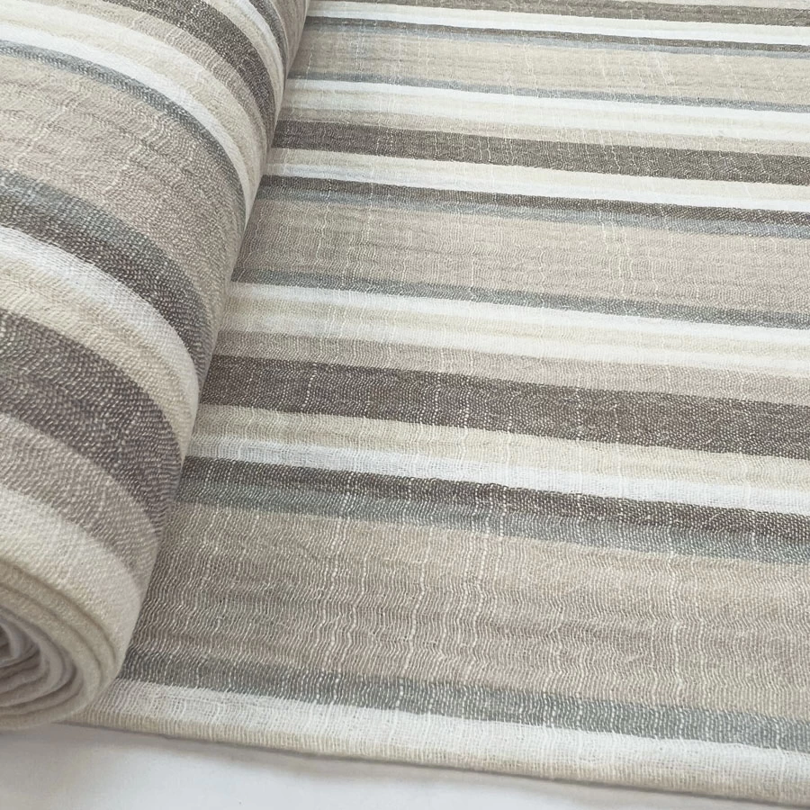 This fabric has a beige, grey and white striped cotton layer tacked onto a white cotton reverse.