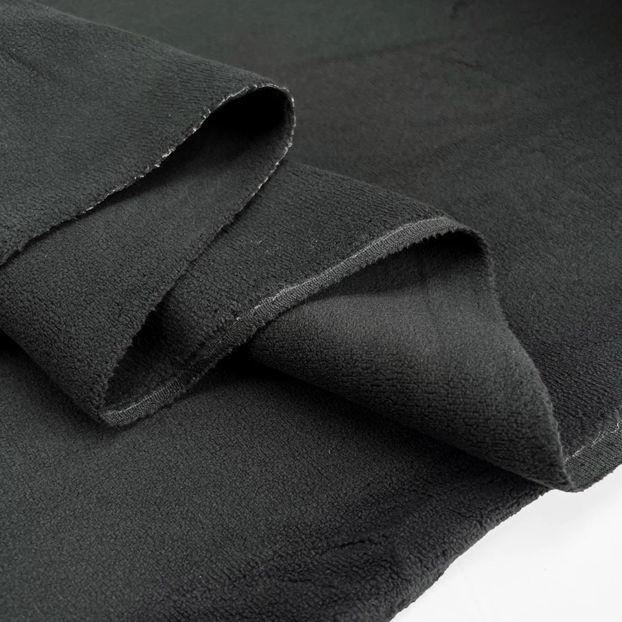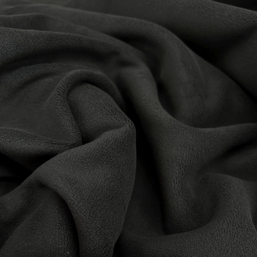 180cm wide double-sided plush stretch fleece in black – a luxurious blend of polyester and spandex. With a substantial weight of 390gsm, this medium-weight fleece promises both warmth and exquisite softness.