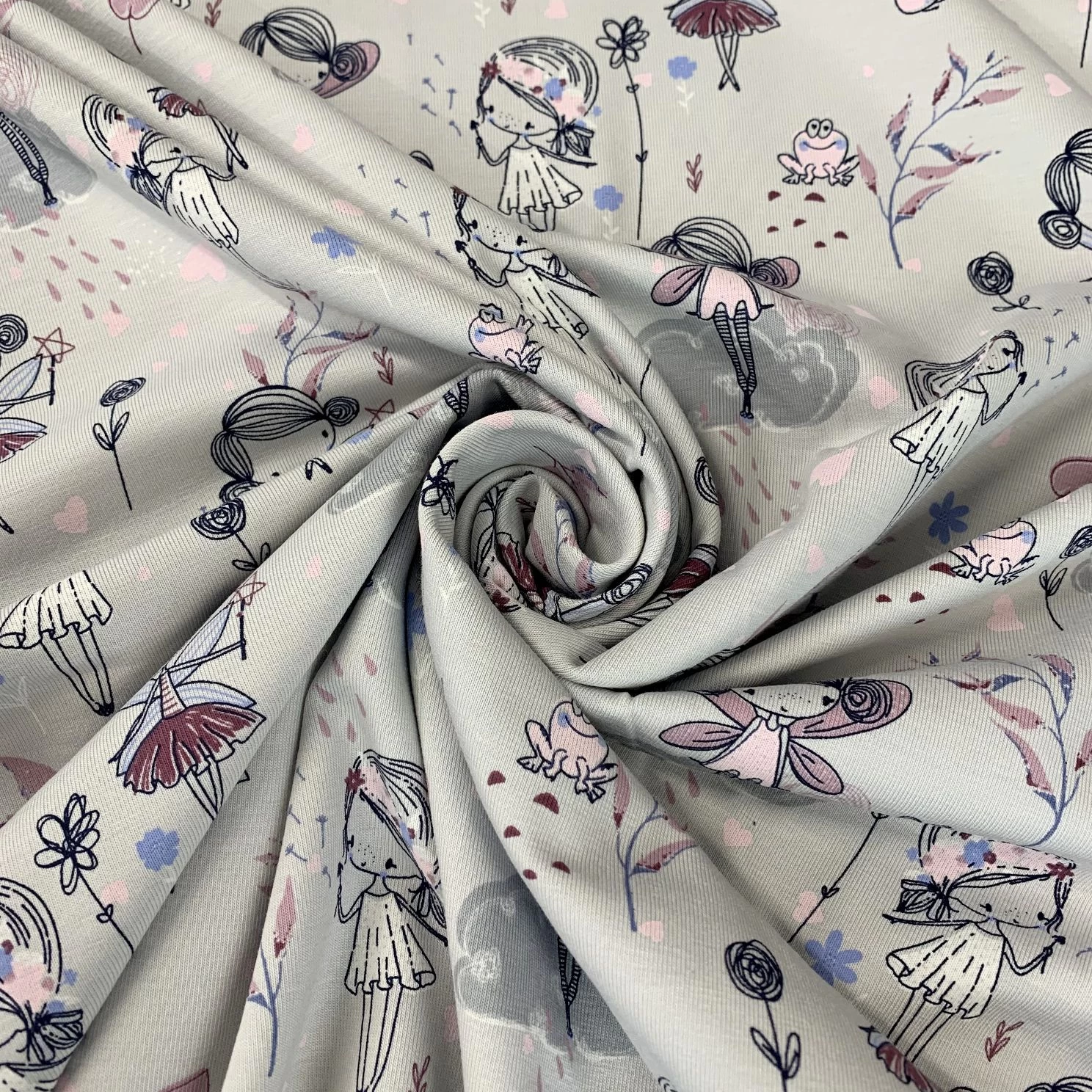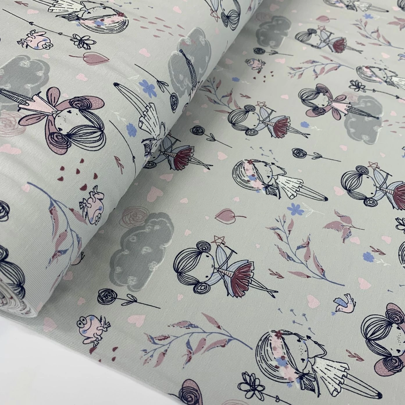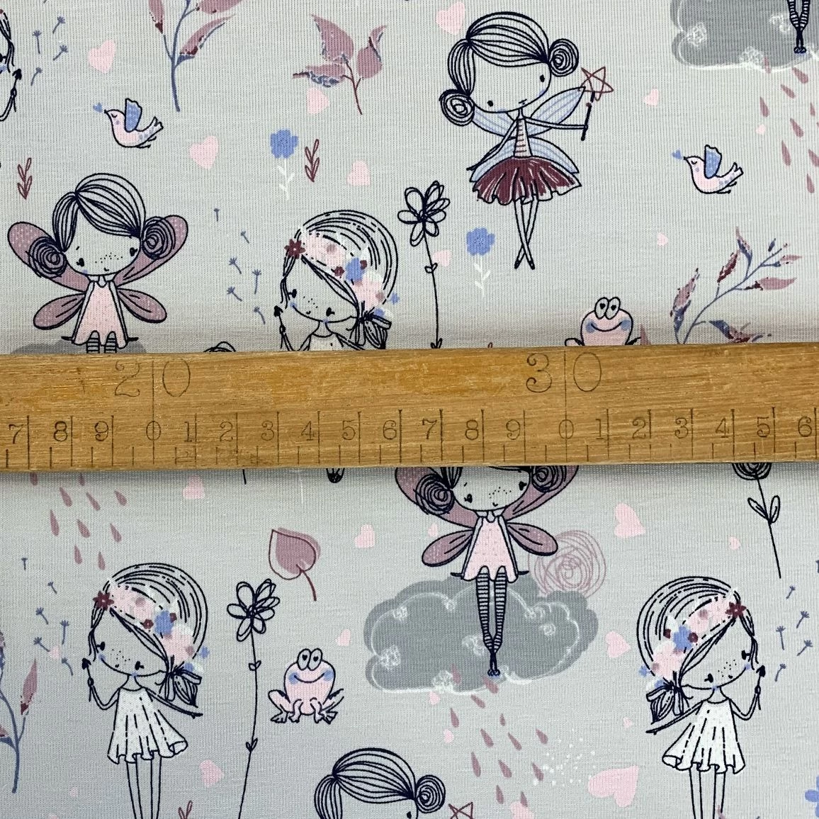 145cm wide, OEKO-TEX 100 cotton stretch jersey in grey with an all over fairy print, perfect for children’s clothes, by Ojutie kids collection.