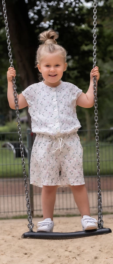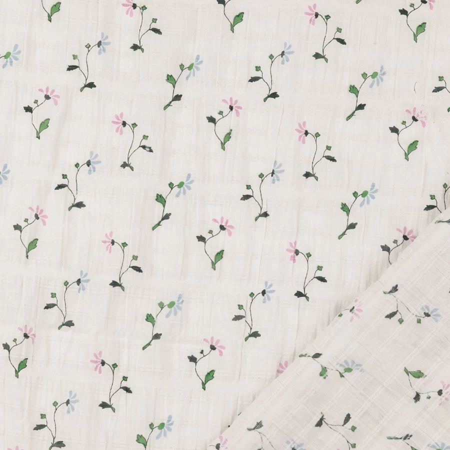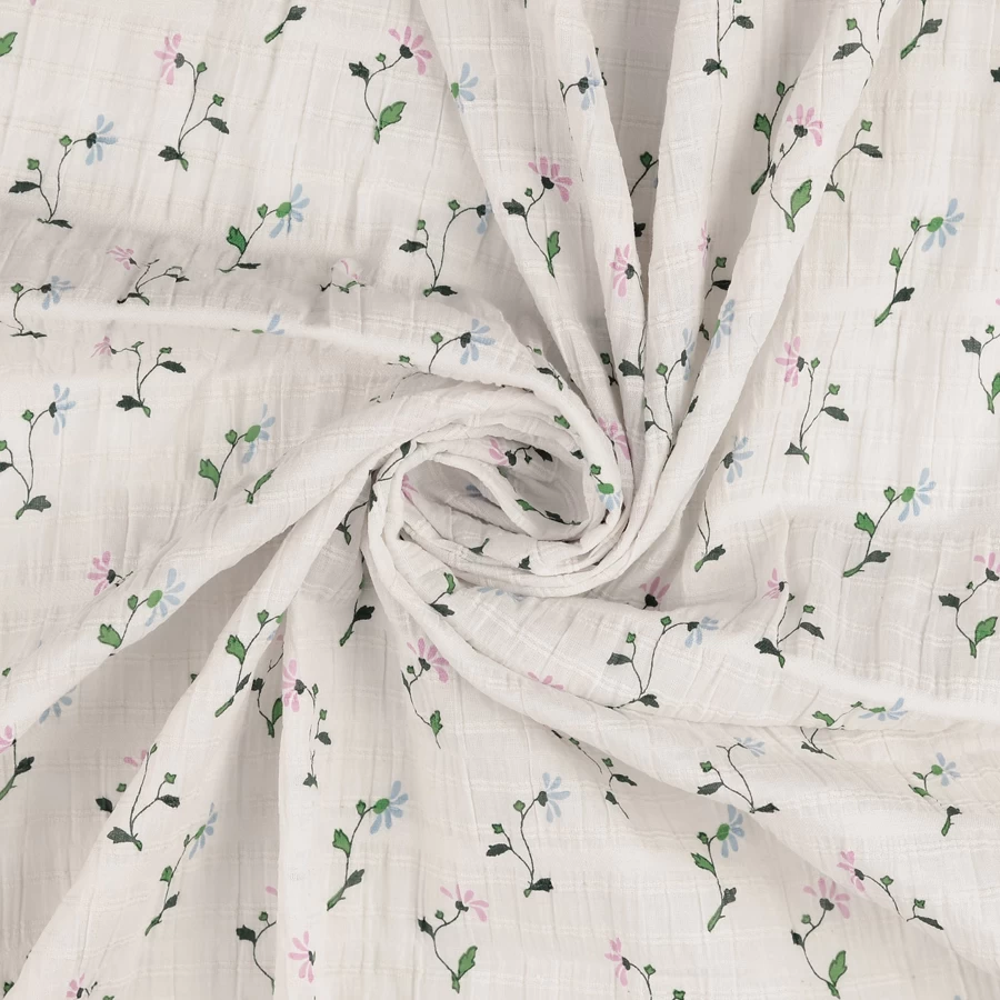 Our 136cm wide, cotton voile and elastane mix dress fabric in white features a minimal floral print, ideal for kids’ wear!