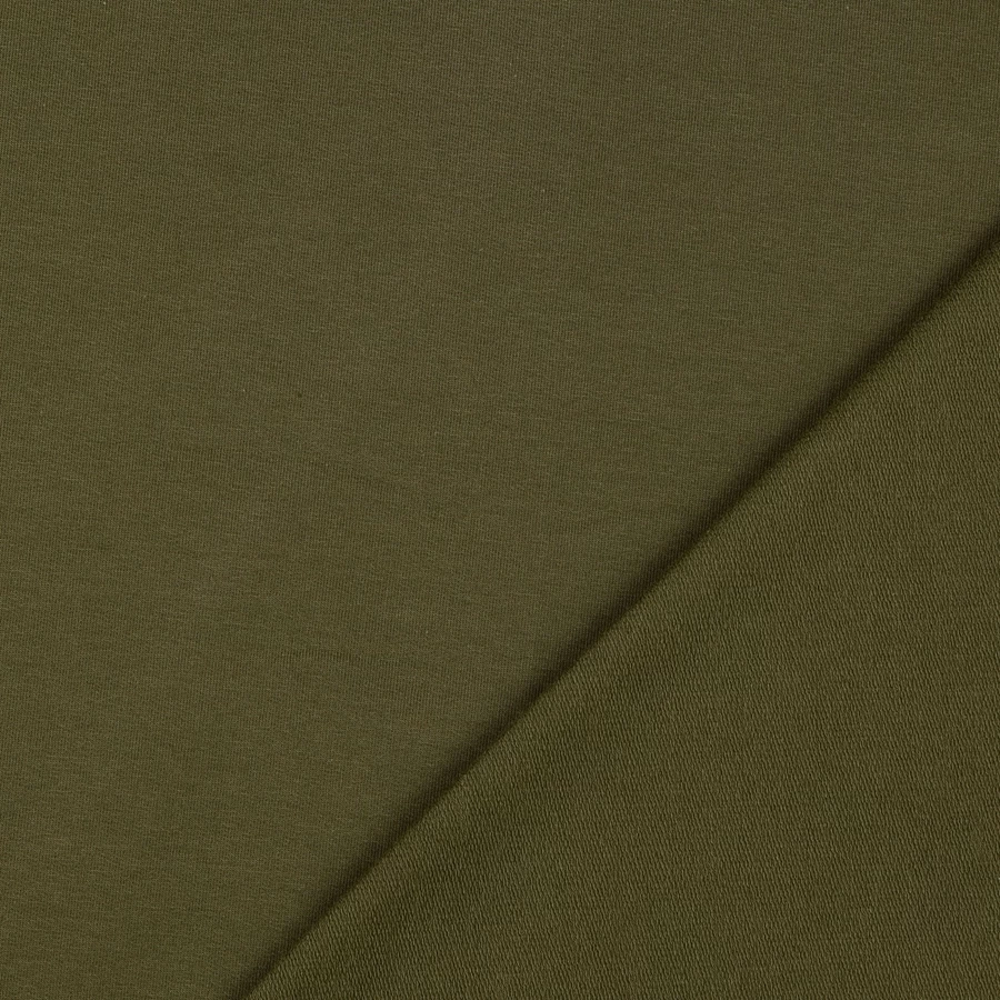 Our 150cm wide plain French Terry jersey fabric in a dark olive shade features a looped back and is ideal for joggers, dressmaking or leggings!