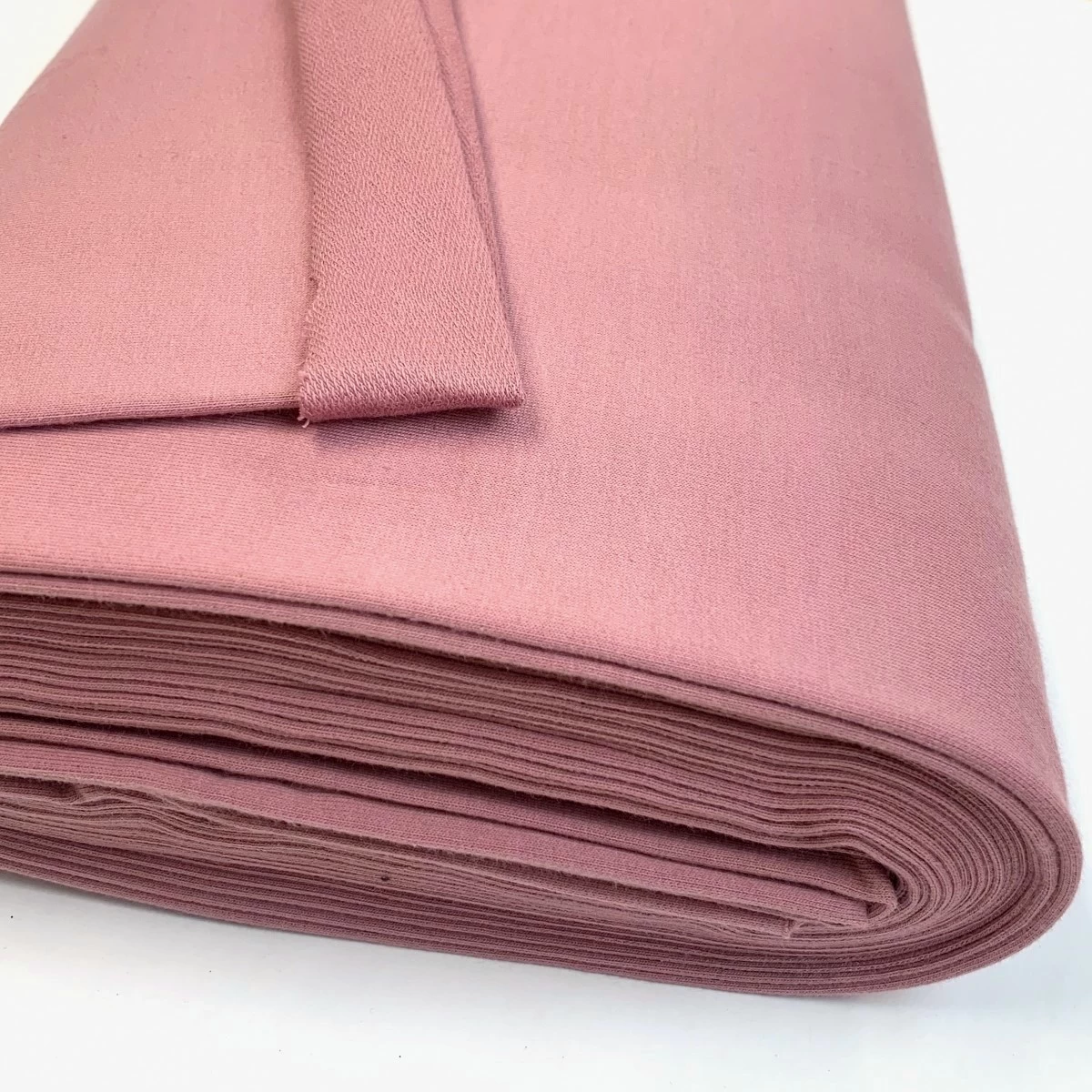 Plain milkshake pink 95% Cotton, 5% Elastane French Terry jersey fabric with a looped-back, so has good stretch and recovery. If the weight helps you it is 230gsm (10oz per m²) but in real terms this is a great jersey material for sweatshirts, joggers, dresses and leggings.
