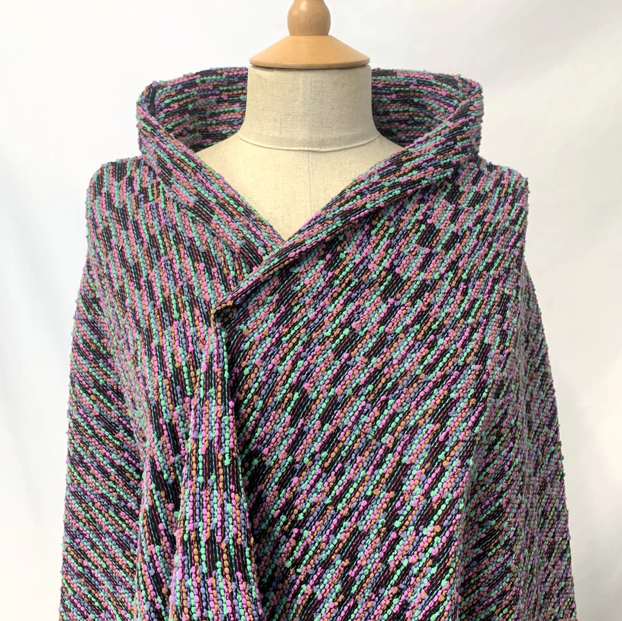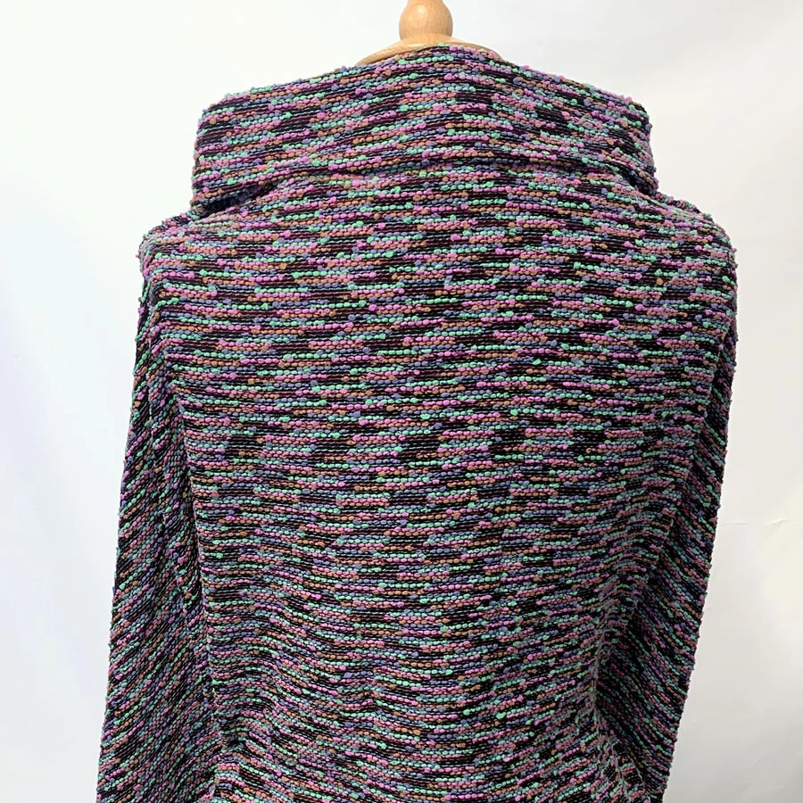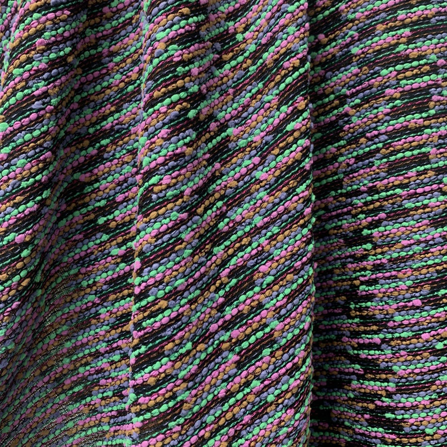 | Special jacketing fabric in a multicoloured tapestry weave. The back of the cloth is a fine black linen into which has been a woven chenille type yarns in green pink lilac and a soft brown. A Very interesting fabric which is made in cotton, viscose, linen and nylon | |