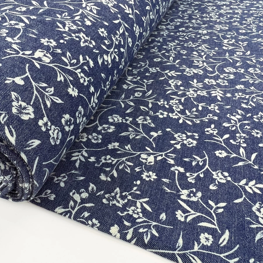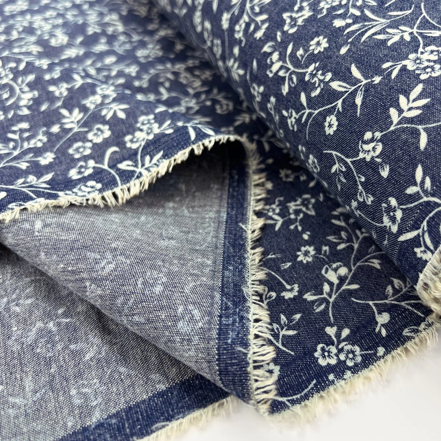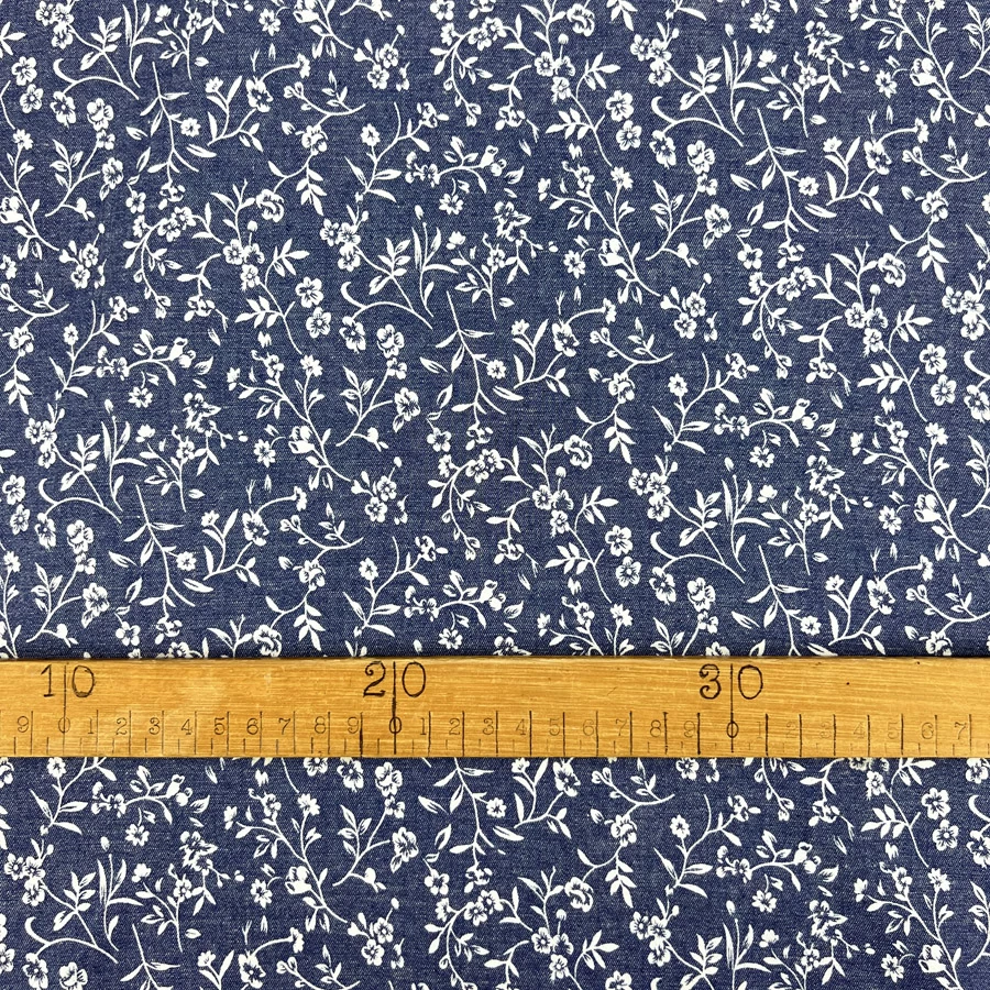 148cm wide printed lightweight blue denim chambray fabric, with a classic vintage floral design in soft white. It is 120 grams per m², approx 4oz denim shirting.