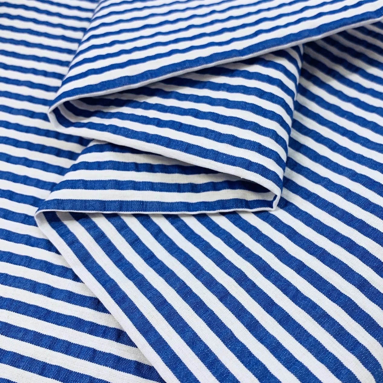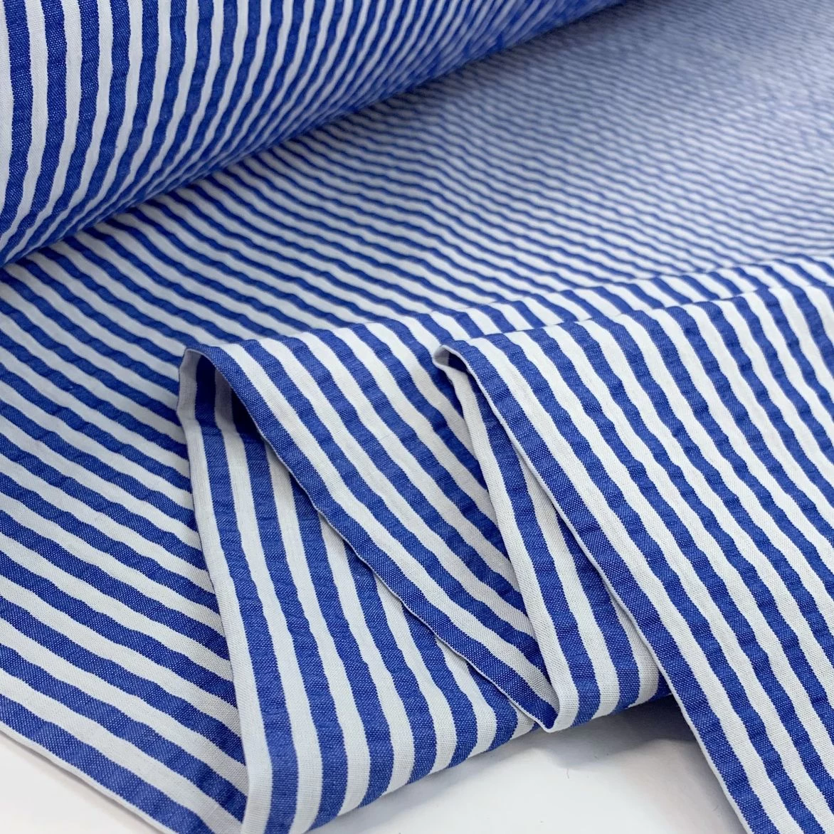 | 150cm wide, 100% cotton seersucker fabric, superb for summer shirts with a white & royal blue stripe design. This fabric is perfect for warmer weather, seersucker first became popular in Britain’s warm weather colonies like British India. One of the best things about the preppy puckered fabric? It doesn’t need to be ironed (so it’s great for traveling). For some this would also be the ideal fabric for a pillow case & bed sheets & more. OEKO-Tex® Standard 100 Product. | |
