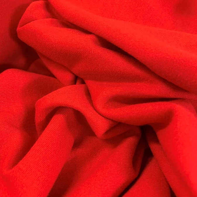 Fabulous 160cm wide cotton interlock jersey fabric in red, proudly knitted in the UK. This mid weight fabric is the ideal choice for t-shirts, tops, underwear, and nightwear, offering endless versatility.