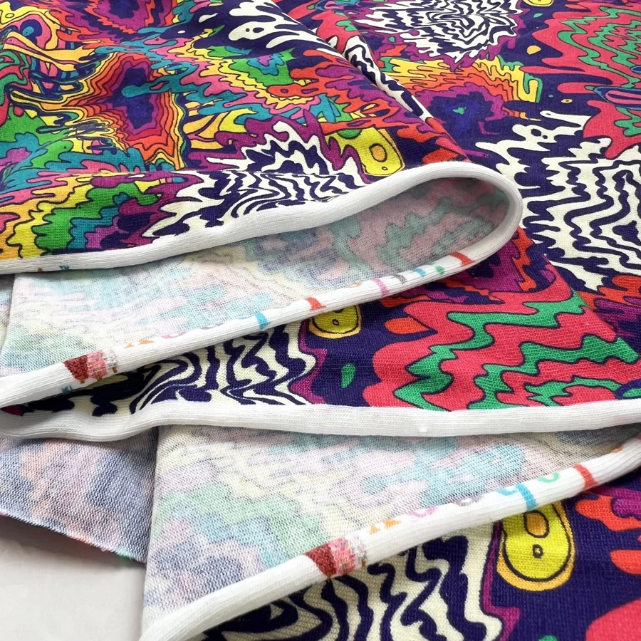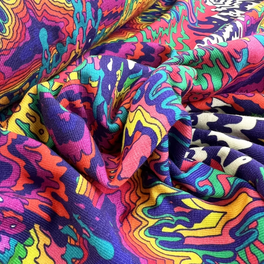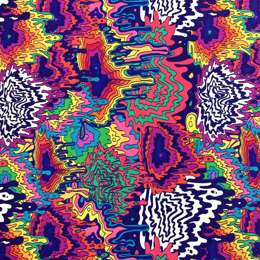 Digitally printed 100% Cotton jersey fabric. A very trippy, rainbow design that looks as if someone tipped a paint shop over!