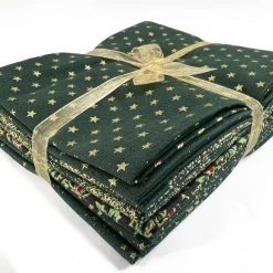 This bundle contains 5 (50 x 52cm) pieces of 100% cotton fabric. All of the fabrics are a forest green with four of them having different gold star designs and one feautring a holly leaf design!