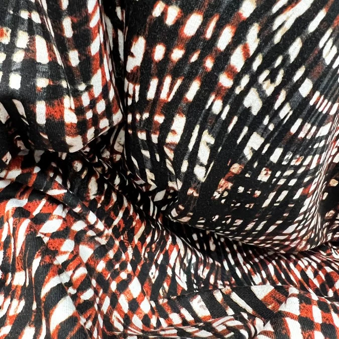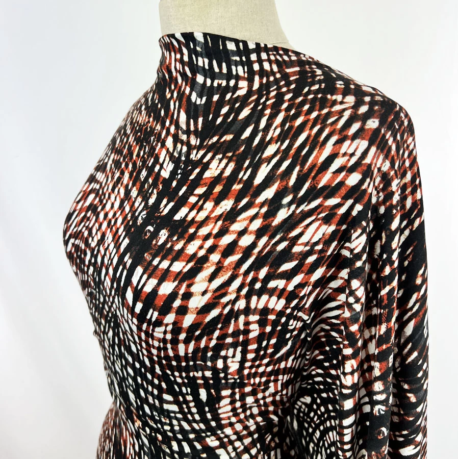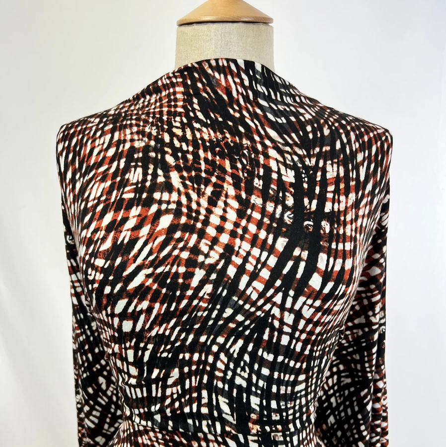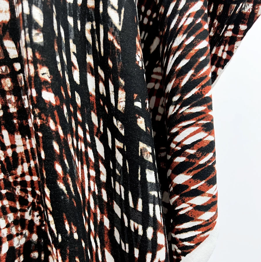 This beautiful lightweight viscose jersey knit dressmaking fabric has a very soft feel, a lovely drape and would be perfect for sewing into tops and dresses. Featuring a checked pattern in rust orange, white and black. 154cm wide breathable fabric can be fashioned into items suitable for warm days such as a loose bandeau tops, or made into long dresses under a cardigan or jacket when things turn a little cooler.