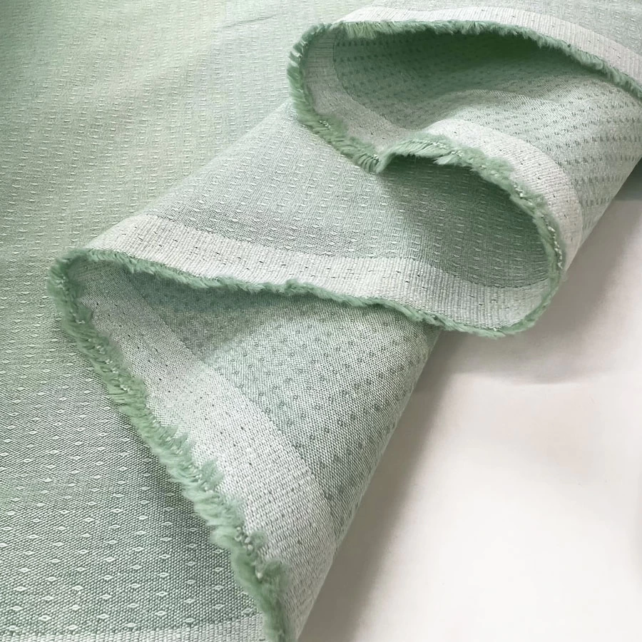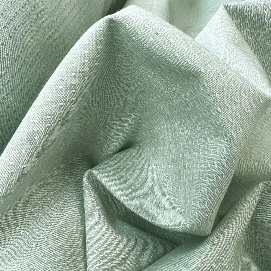 Featuring a popular dobby weave, this light pale green cotton and elastane fabric showcases a simple, yet elegant spotted design.