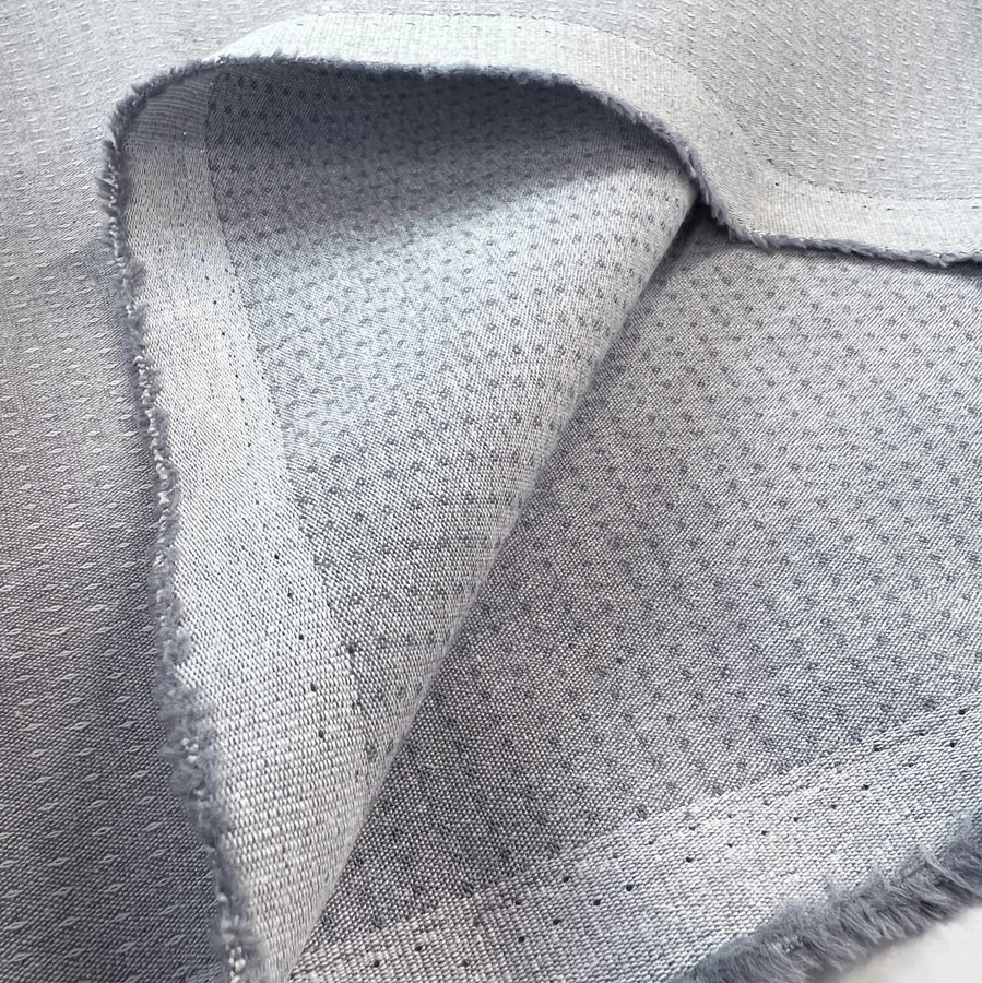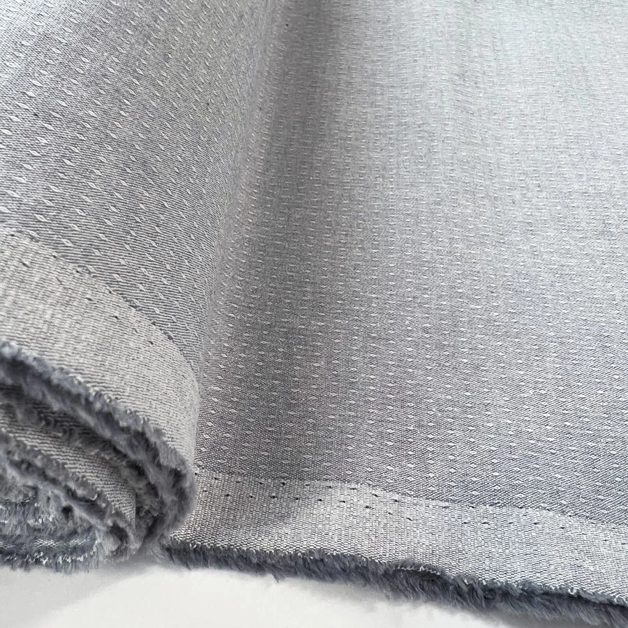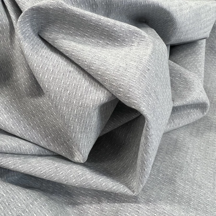 This gorgeous cotton chambray fabric has a light grey/silver appearance with a delicately woven spotted design.