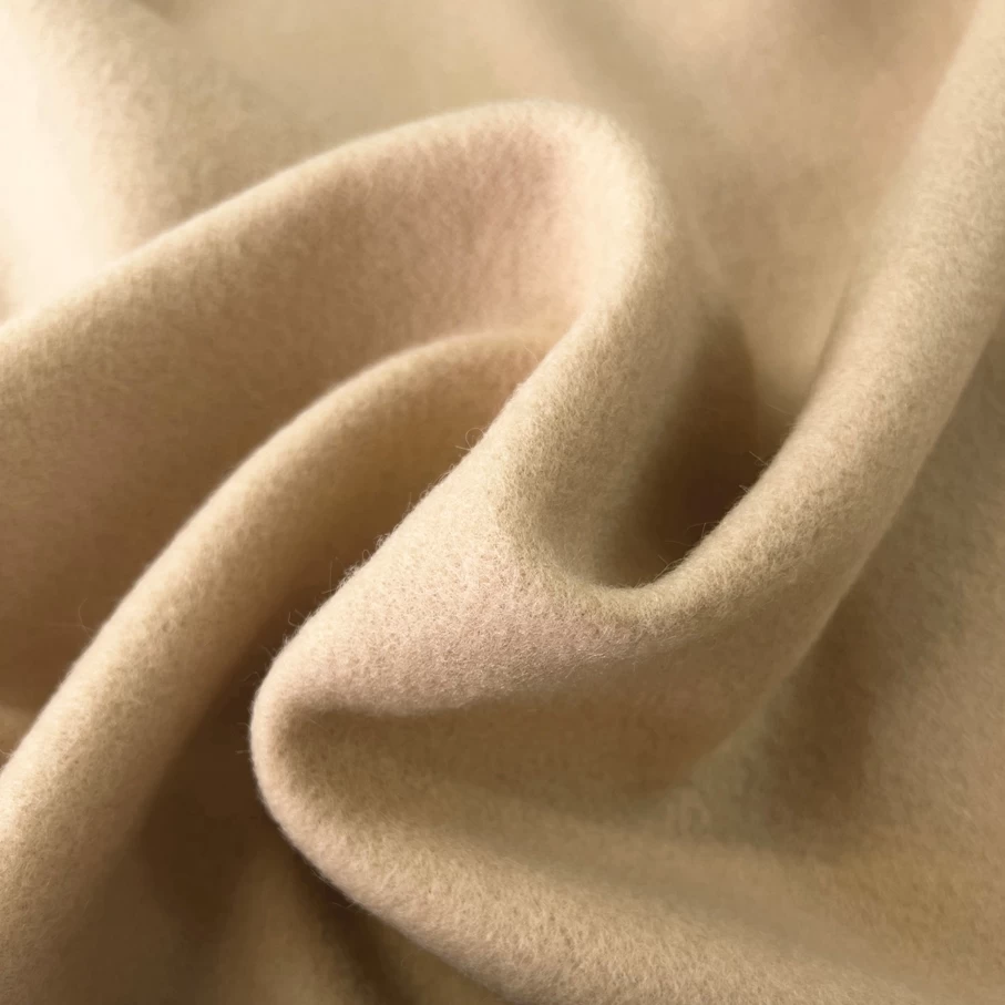 Soft knitted mouflon flannel coating fabric in cream. It has a brushed fleecy surface and is warm, soft and cosy. The knitted construction means it doesn’t fray and has a tiny amount of mechanical stretch. It comes in a blend of 67% polyester and 33% acrylic so it is easier to care for than a real wool mouflon.