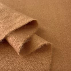 Soft knitted mouflon flannel coating fabric in tan. It has a brushed fleecy surface and is warm, soft and cosy. The knitted construction means it doesn’t fray and has a tiny amount of mechanical stretch. It comes in a blend of 67% polyester and 33% acrylic so it is easier to care for than a real wool mouflon.