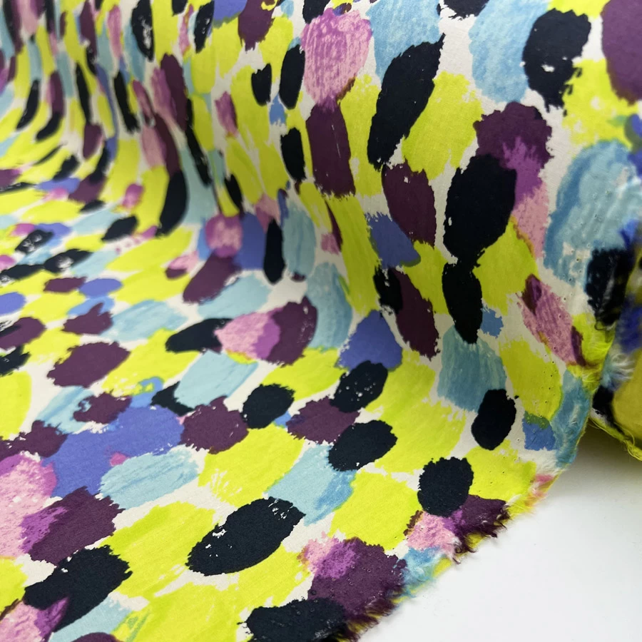 One side of this fabric has a painterly pattern made up of purple, blue and yellow hues, flip it over and you’ll find a plain, simple yellow green reverse, offering versatility and endless possibilities for your creations.