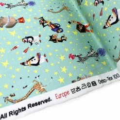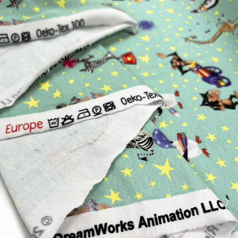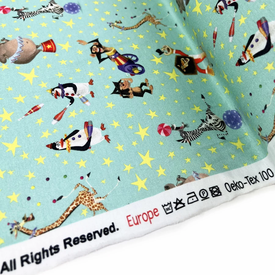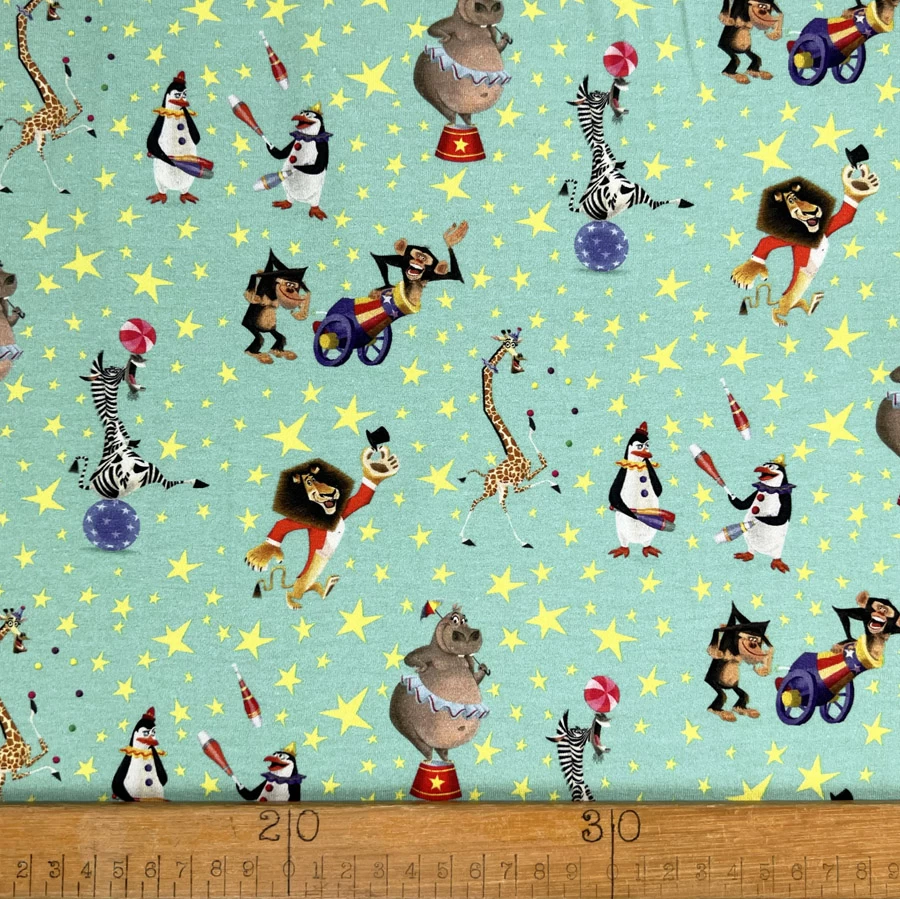 This OEKO-TEX licensed Madagascar circus print jersey fabric in aqua is 95% cotton and 5% elastane; it’s a quality cloth for sewing!