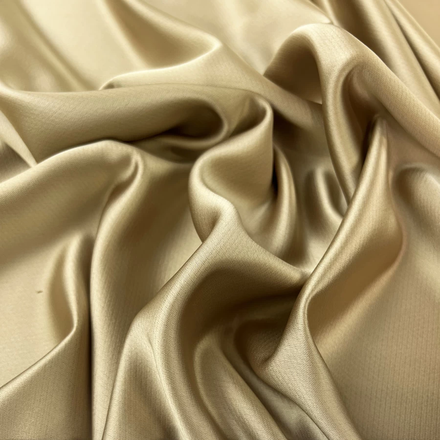 This stunning quality bridal satin fabric is the perfect choice for any special occasion dress. With a soft metallic gold hue, this fabric will add a touch of glamour and sophistication to your next design.
