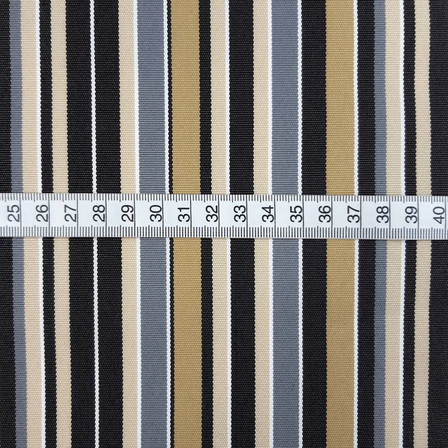 At approximately 270gsm in weight, this fabric has a sturdy yet comfortable feel, providing a perfect balance of strength and comfort for your outdoor seating and décor. The stripe pattern in beige, white, black, grey and dull ochre adds a touch of style and sophistication to any outdoor space, making it a great choice for use in a variety of settings.
