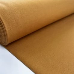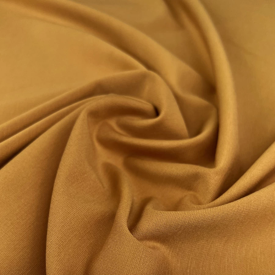 This high quality knitted 152cm wide, 320gsm Ponte Roma fabric has mustard yellow hue. With plenty of viscose to give it a soft hand, the nylon providing sturdiness and with a hint of elastane that gives the cloth a subtle stretch and great recovery.