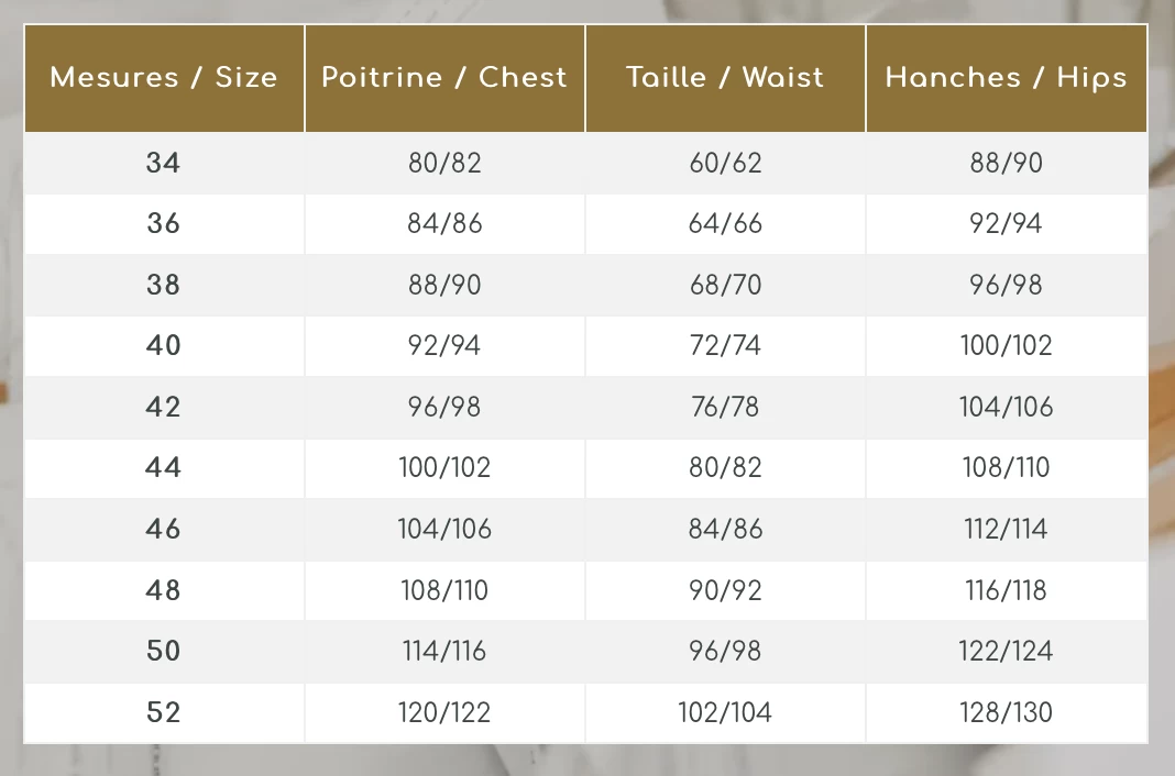 Sizes: EU 34-52 (approximately UK 6 – 22 based on our size chart)