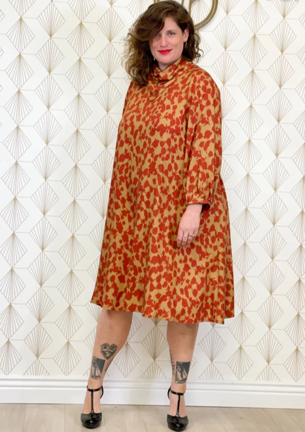 Mia is a versatile dress that features a delightful surprise in the form of a scarf collar or an elegantly sophisticated officer collar, depending on your preference. On the reverse side, you can opt for a demure neckline that accentuates the upper back or a plunging neckline that adds a touch of glamour to the look. The silhouette is flowy and the cut flares out gently from the chest down to the knee, creating an airy and comfortable fit.