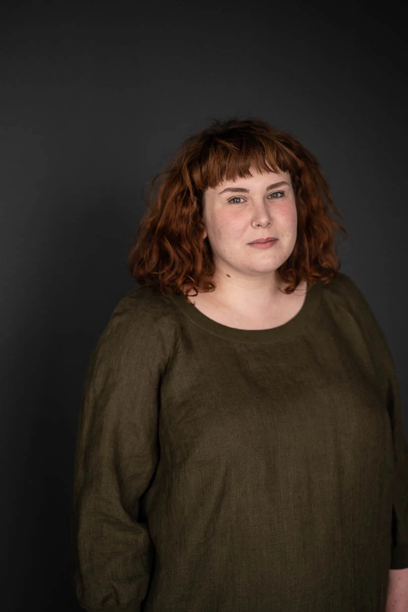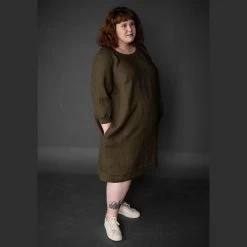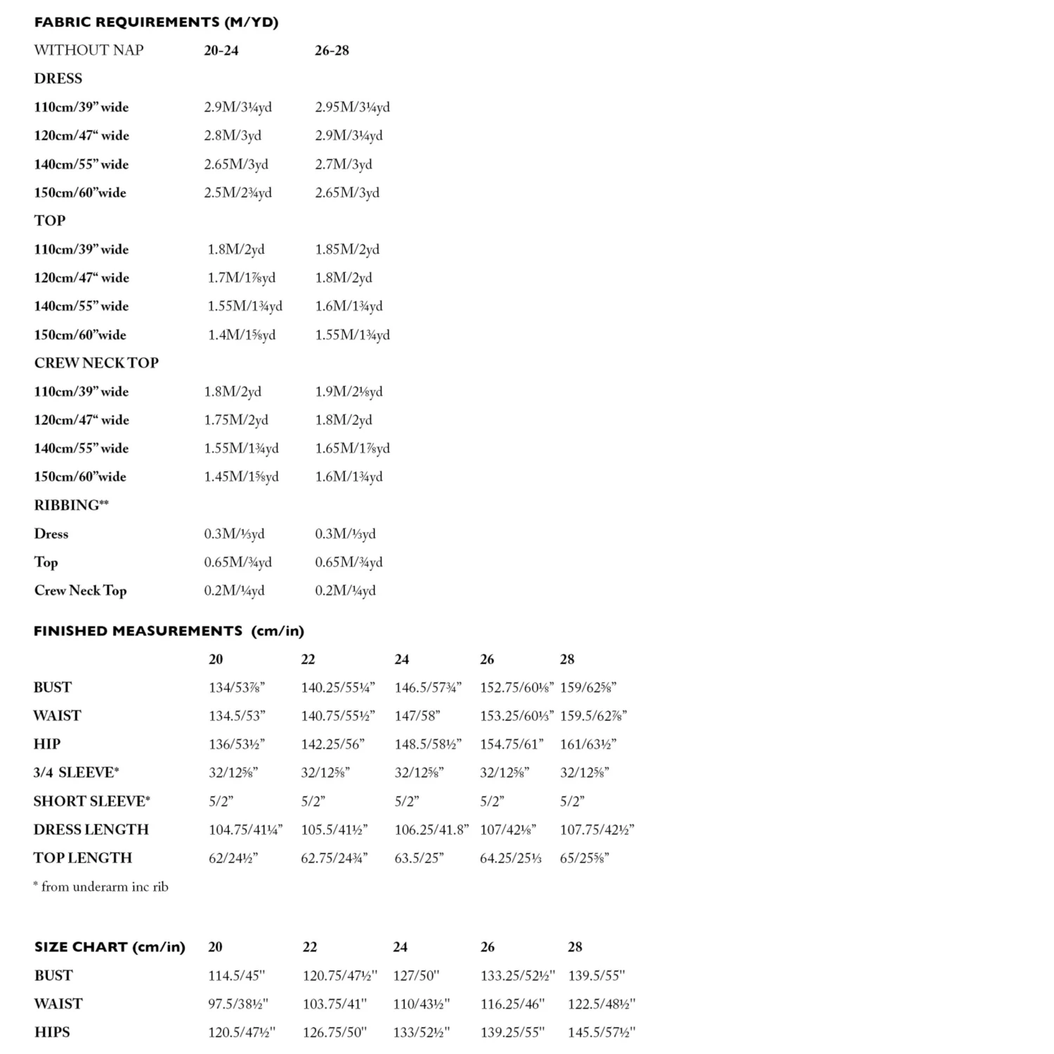 The Fielder pattern offers a traditional sweatshirt-style top or dress with ribbed neck, sleeves, and hem (for tops), plus three-quarter length raglan sleeves and inseam side pockets (for dresses).
