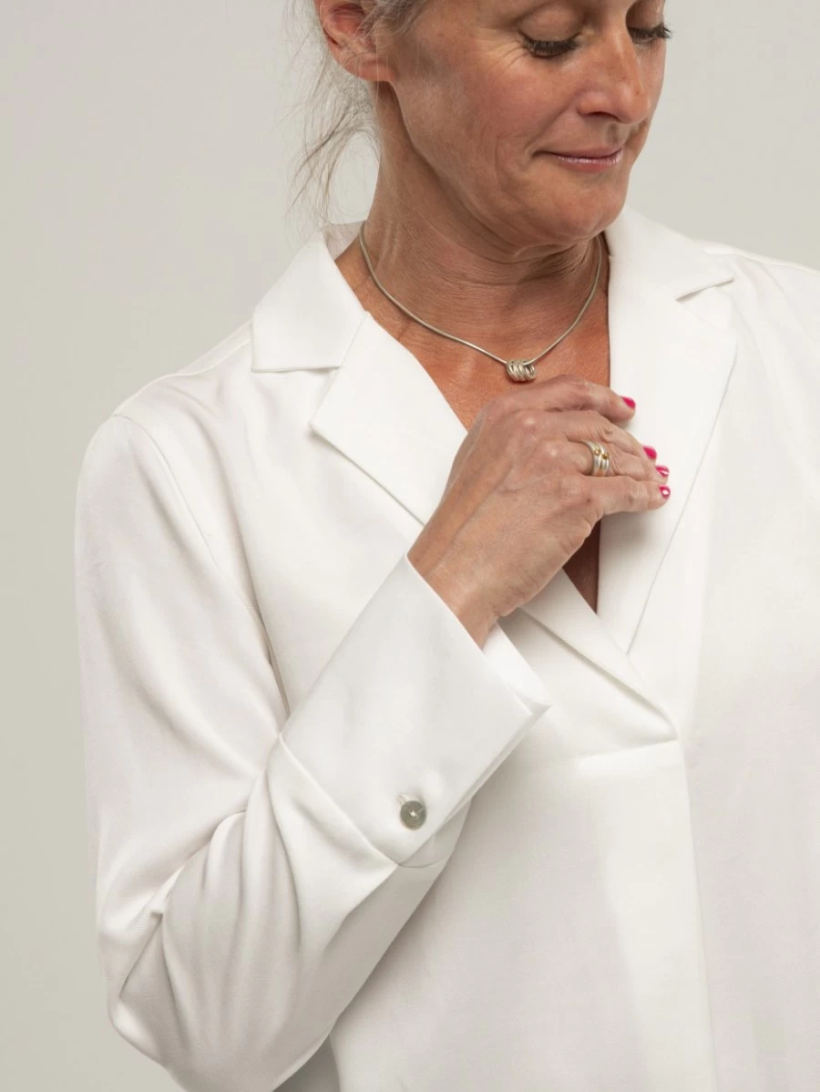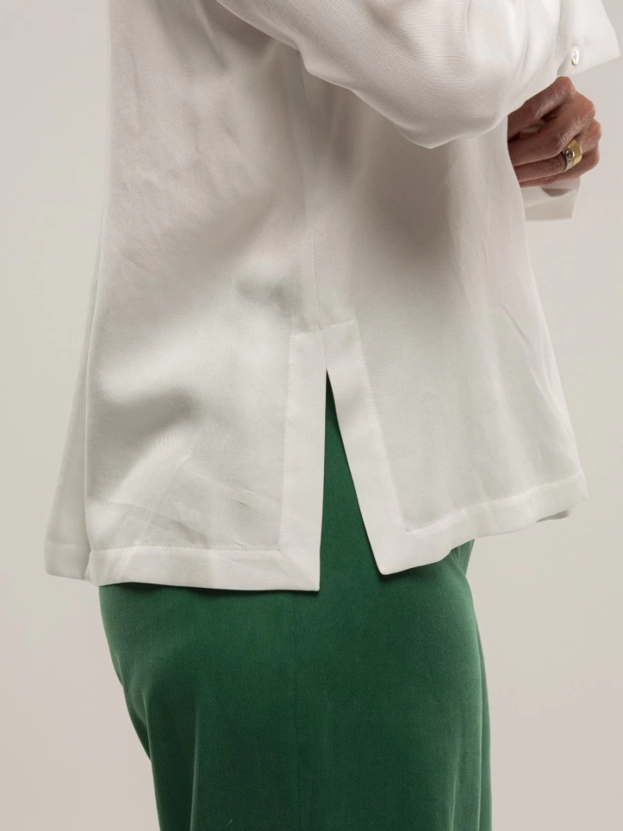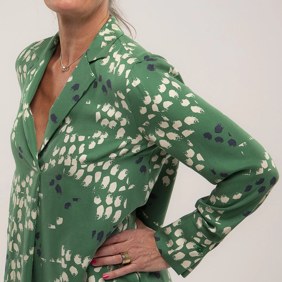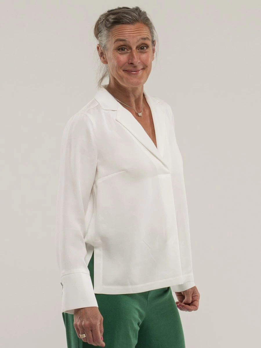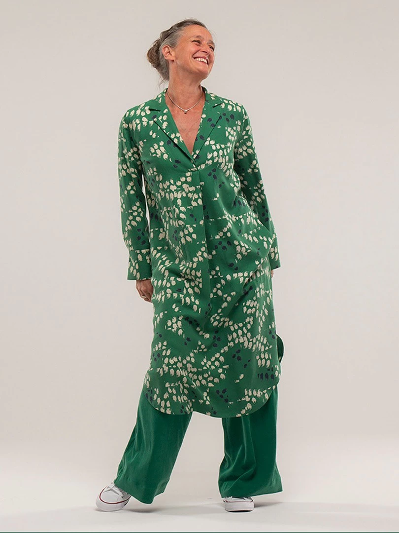 The Ester shirt is designed with a stylish notched collar and features a pleat at the bottom of the neck opening, adding a touch of extra width to the garment. Bust darts are thoughtfully incorporated to flatter the wearer’s silhouette. Ester is available in two different lengths and with two distinct bottom hems. The longer version includes side pockets and a centre back seam to achieve a more defined shape. For the shorter version, the wearer can choose between gathers below the yoke or a sleeker, non-gathered look.
