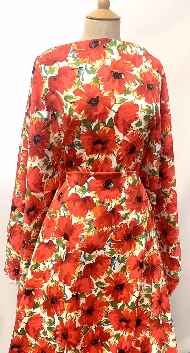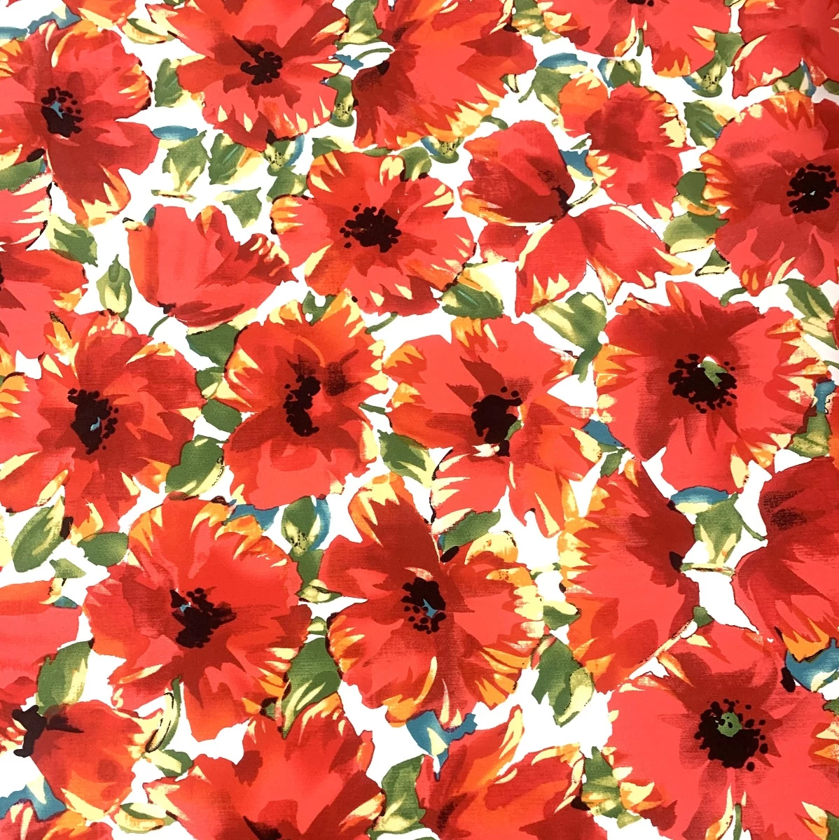 Cotton elastane dress fabric in white with a large red and green floral print. This is not a stiff cotton, it appears to have a ‘washed’ finished so is a little bit softer than a normal cotton elastane trousering. Good for skirts, dress and even trousers.