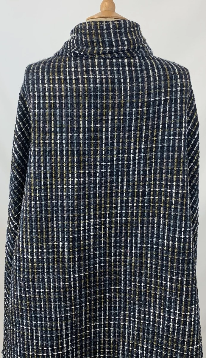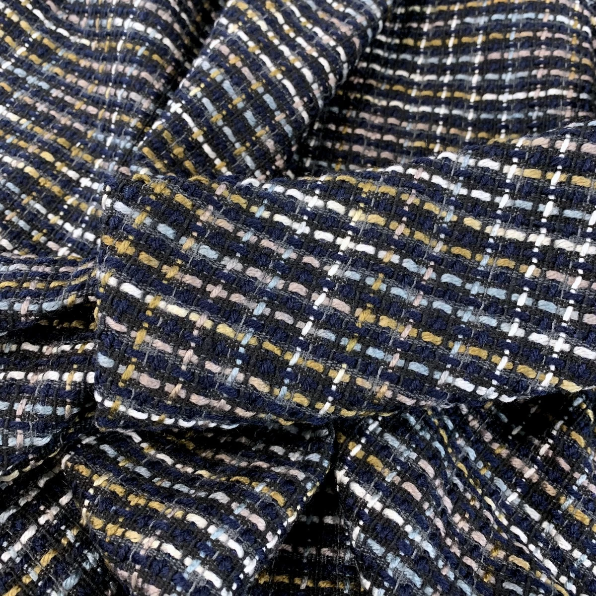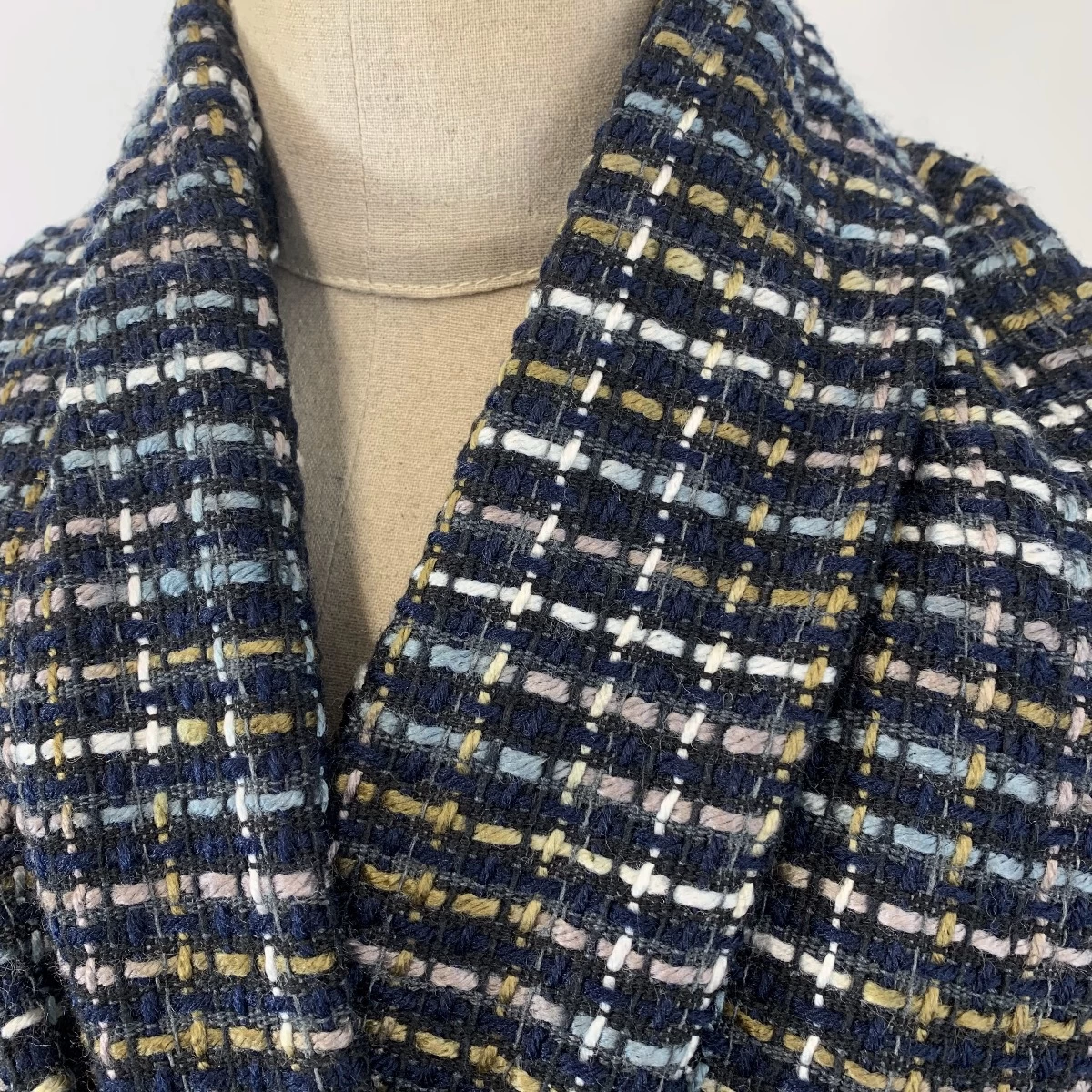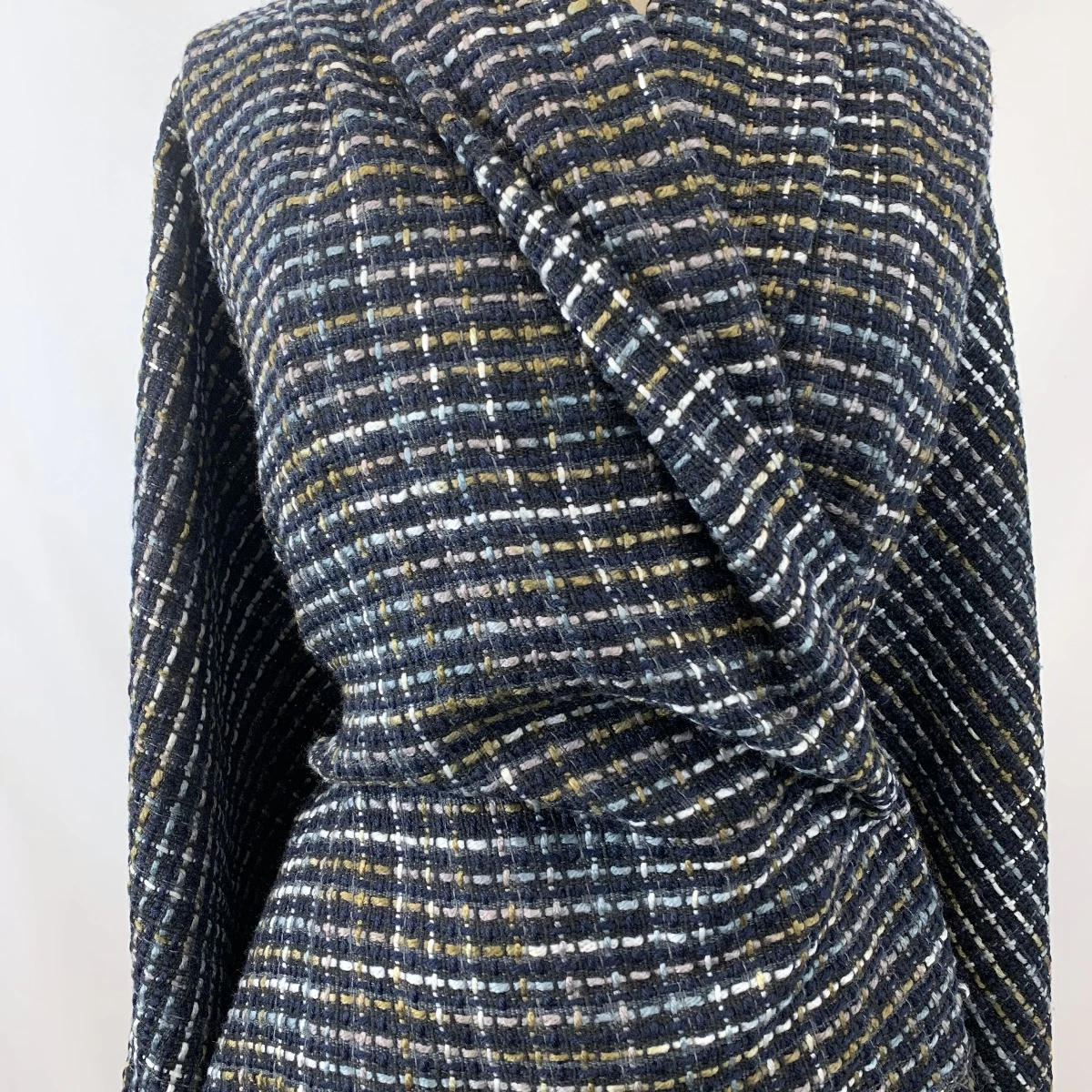 | Navy tweed jacketing and coating fabric made with chunky yarns. A midweight polyester and acrylic tweed fabric that is suitable for jackets and coating. This fabric ideally should be lined to give it the best finish. The yarns are very chunky and do fray, however, it is not difficult to work with. It is not as quite as complex as a Chanel tweed but, with the right pattern, you can make a tweed suit or coat that will look a million dollars. | |