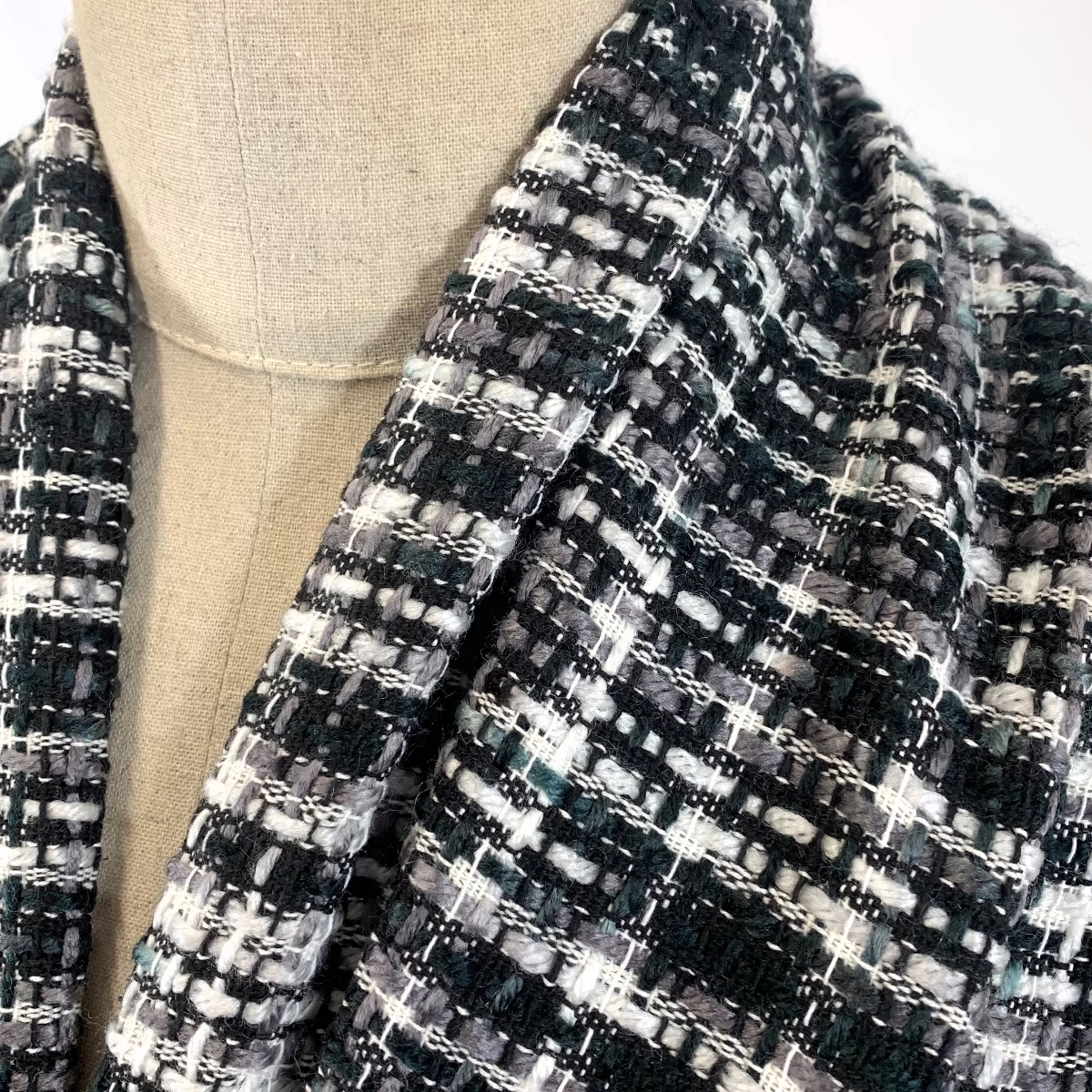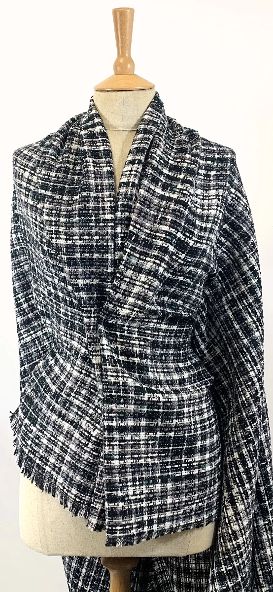 | Chunky tweed jacketing and coating fabric in a large check design in black, grey and white yarns with a tiny hint of teal. A midweight polyester and acrylic tweed fabric that is suitable for jackets and coating. This fabric ideally should be lined to give it the best finish. The yarns are very chunky and do fray, however, it is not difficult to work with. It is not as quite as complex as a Chanel tweed but, with the right pattern, you can make a tweed suit or coat that will look a million dollars. | |