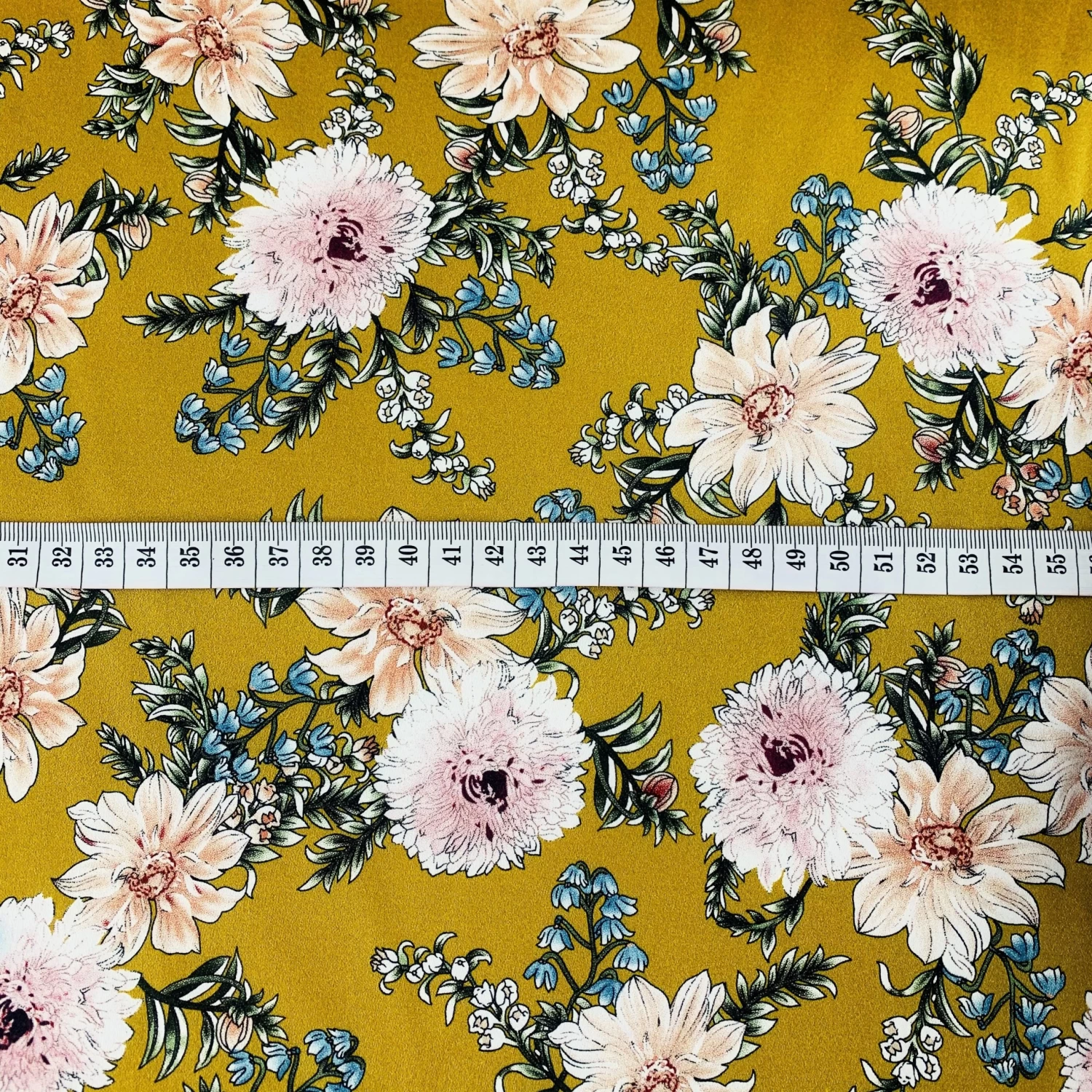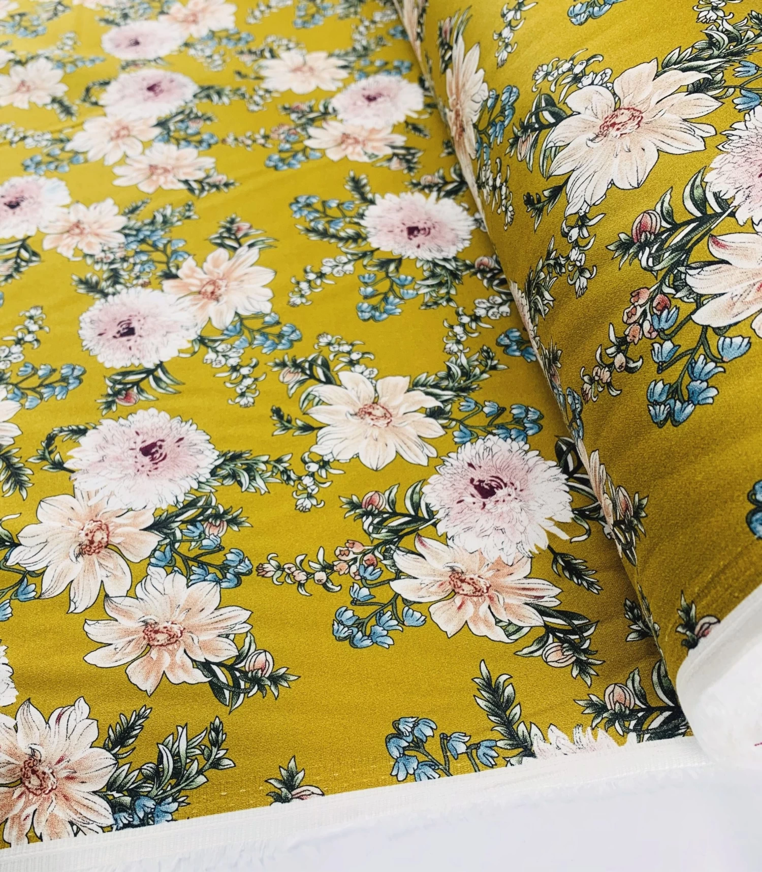 Lovely stretch cotton fabric perfect for sewing dresses, skirts & trousers. Made of 97% cotton 3% elastane stretch cotton dress fabric in ochre with an all over flowers design in nude, blue, green and beige on a deep ochre coloured ground.