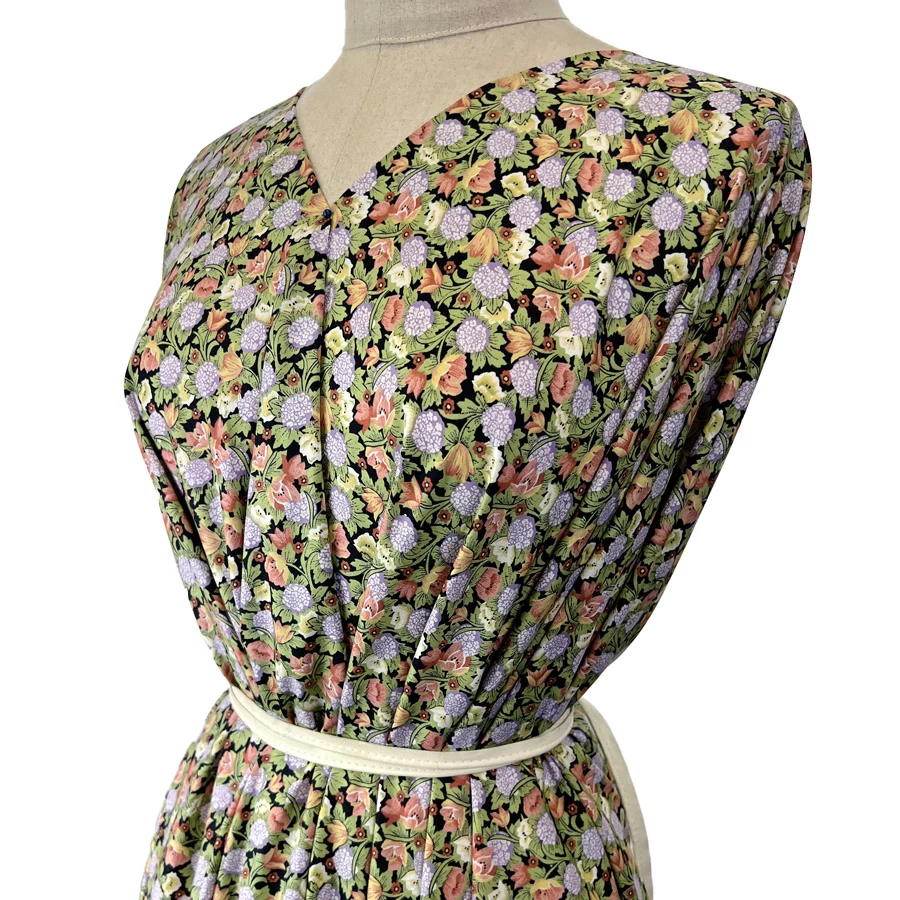 Our stunning 135cm wide Pima cotton lawn has an enchanting all-over flower print in a captivating blend of greens, purples, and oranges against a rich black background.