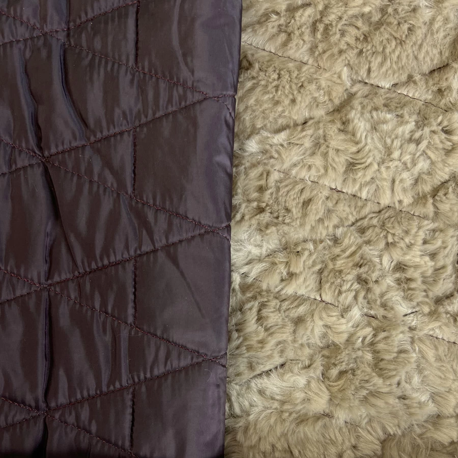 150cm wide faux fur lined quilted fabric, a perfect combination of style and functionality. This fabric features a water and wind-resistant nylon face with a shimmering yet deep, wine red hue that adds a touch of elegance to any project. The reverse side of this fabric is lined with a luscious sandy coloured furry fleece that’s incredibly soft and cosy to the touch, making it perfect for all your cold weather needs.