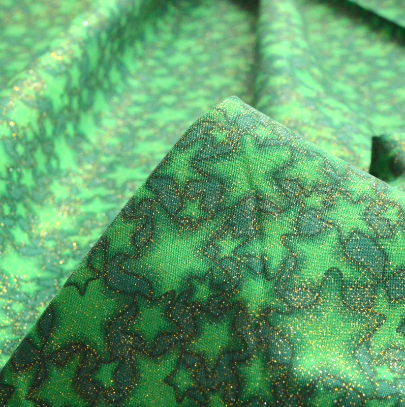| Remnant 112cm wide, Stunning quality craft cotton, this is 100% glittery Christmas cotton fabric in green with al ann over star design. | |