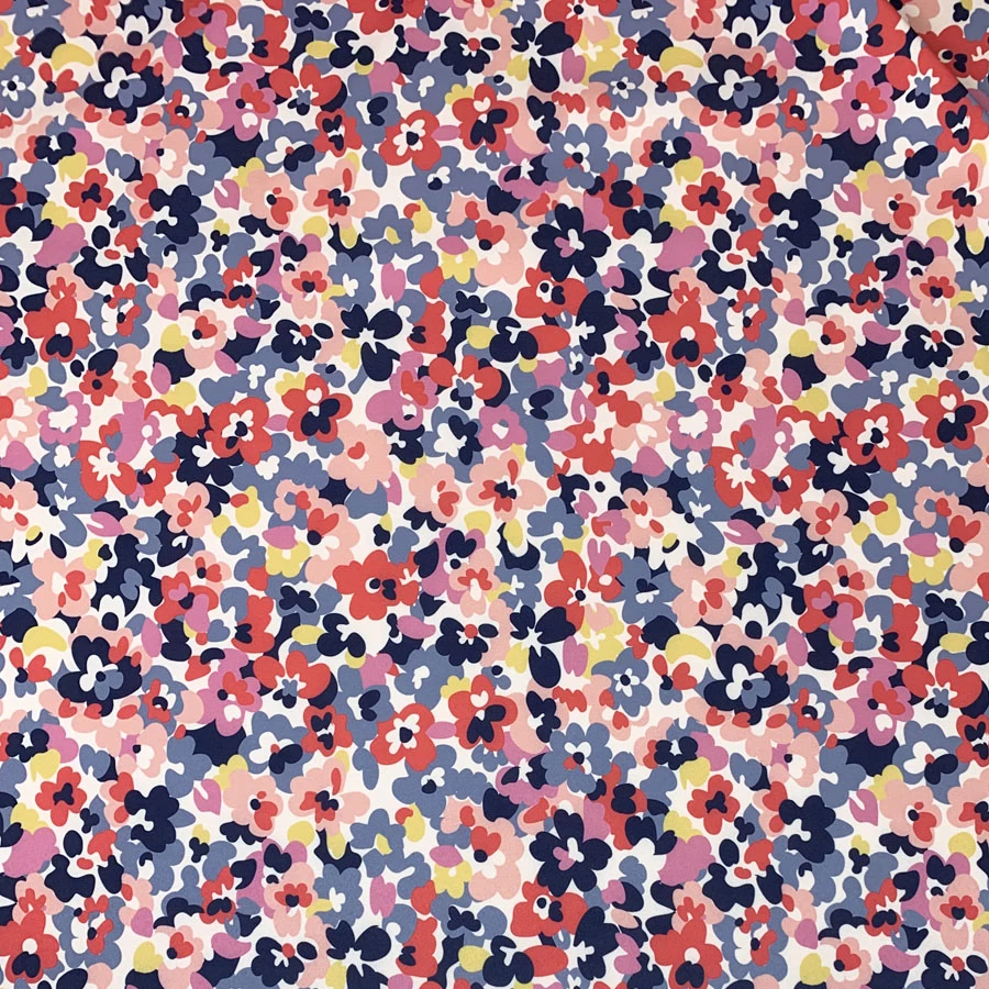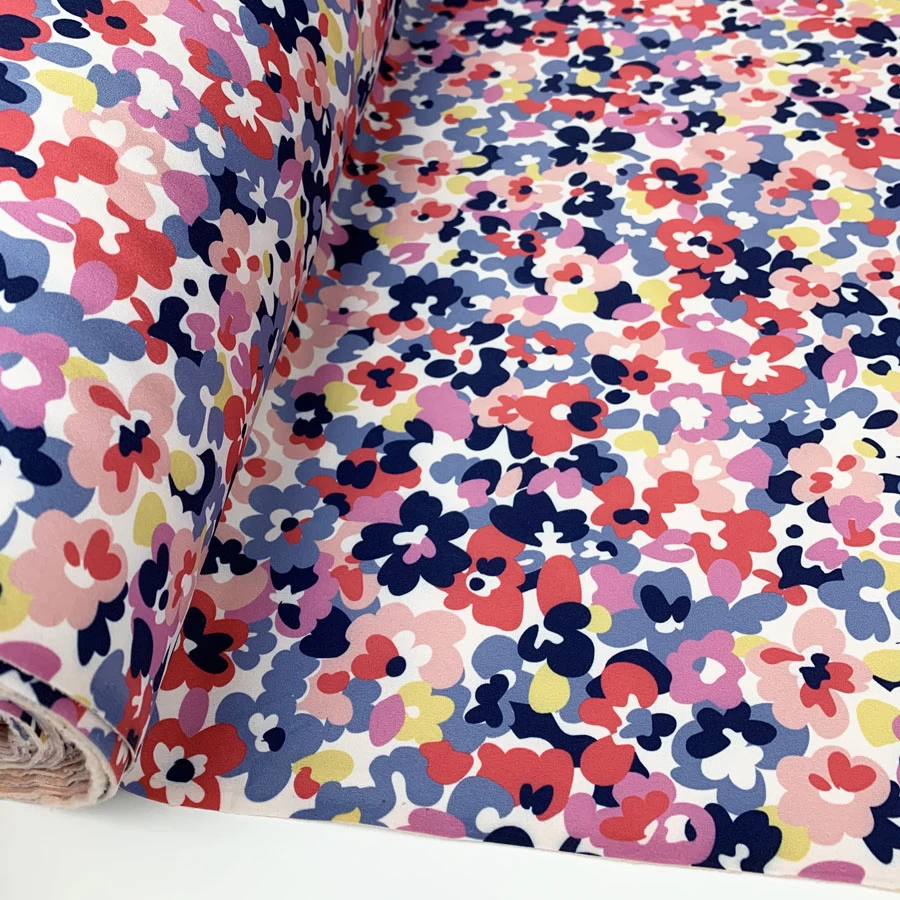 Simply gorgeous soft shell fabric with a colourful pink, blue and purple floral print. A fabric for all seasons, this vibrant print will make statement coats, jackets and accessories.